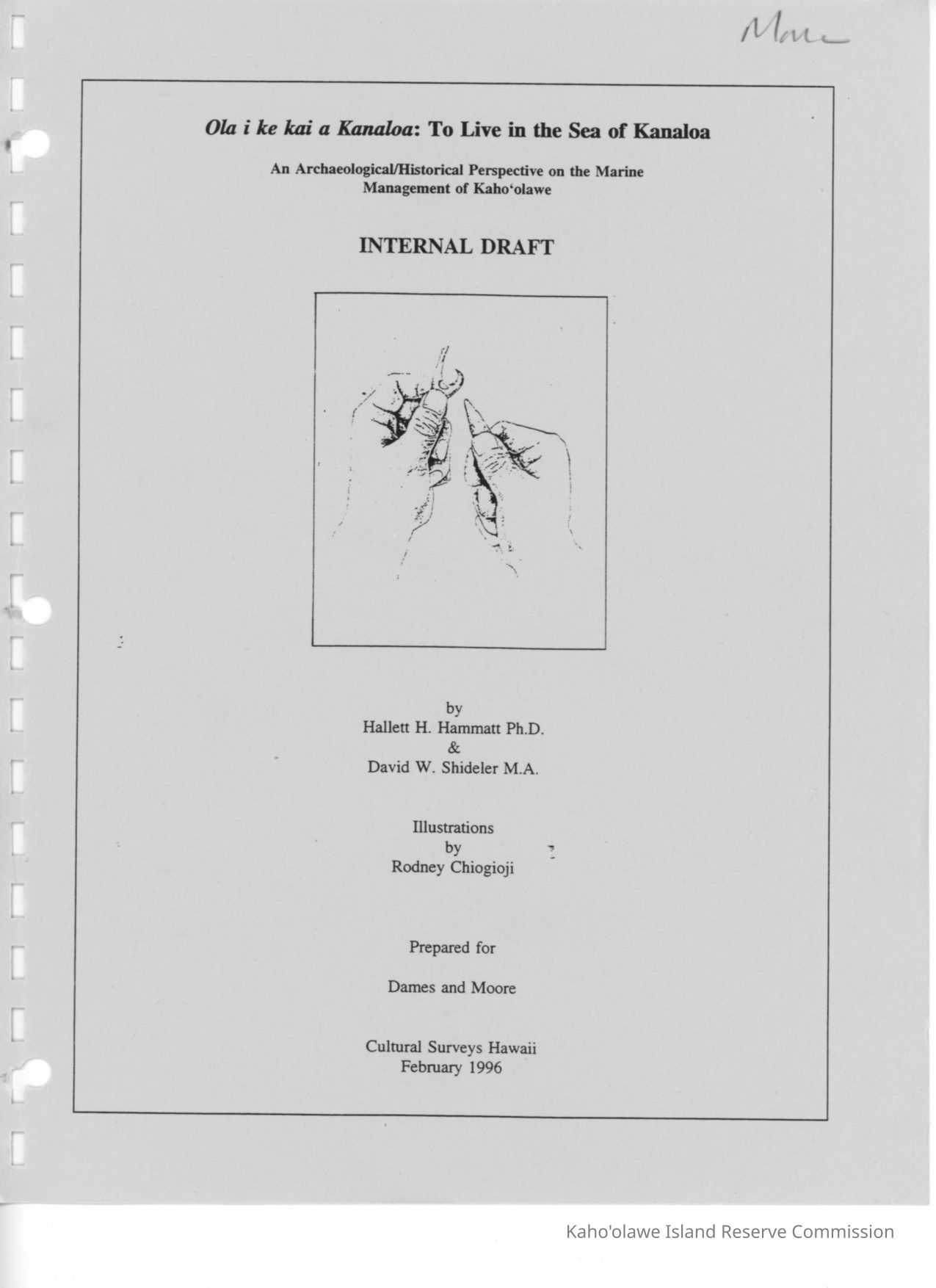 Oli i ke kai a Kanaloa: To Live in the Sea of Kanaloa. Internal Draft by Hallett H. Hammatt Ph.D. & David W. Shideler M.A. 220 copied pages with gray cover and back sheetsCreator