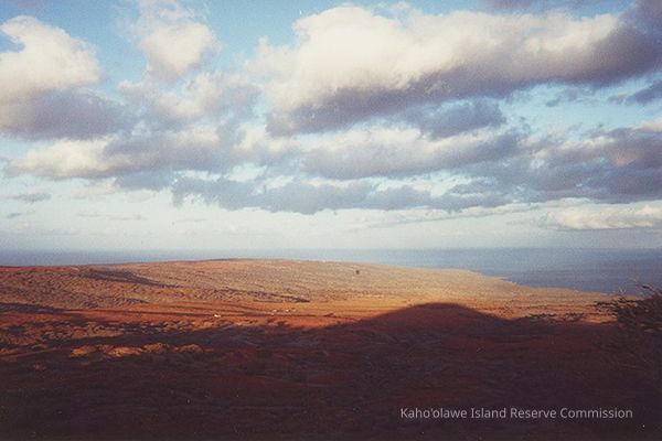 Color photo of an overview of hardpan landscape in an unidentified area with the ocean in the background.Collection