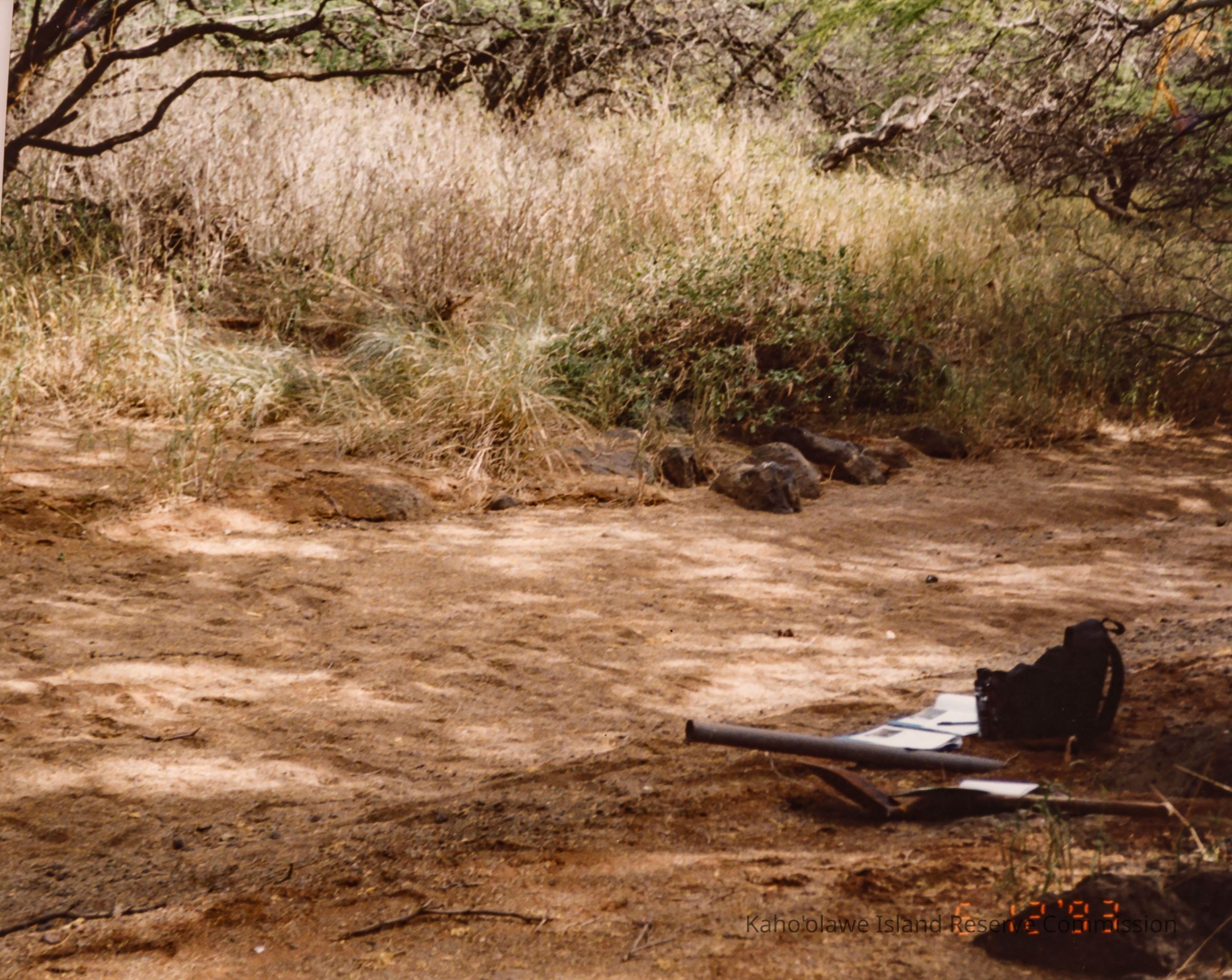 The image depicts a part of sandy trail or road in a sandy landscape with dry grass and scattered trees under a clear sky