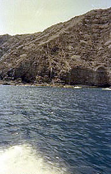 Color photo of part of the Kaho'olawe coastline taken from the ocean, possibly from onboard the Hakilo.