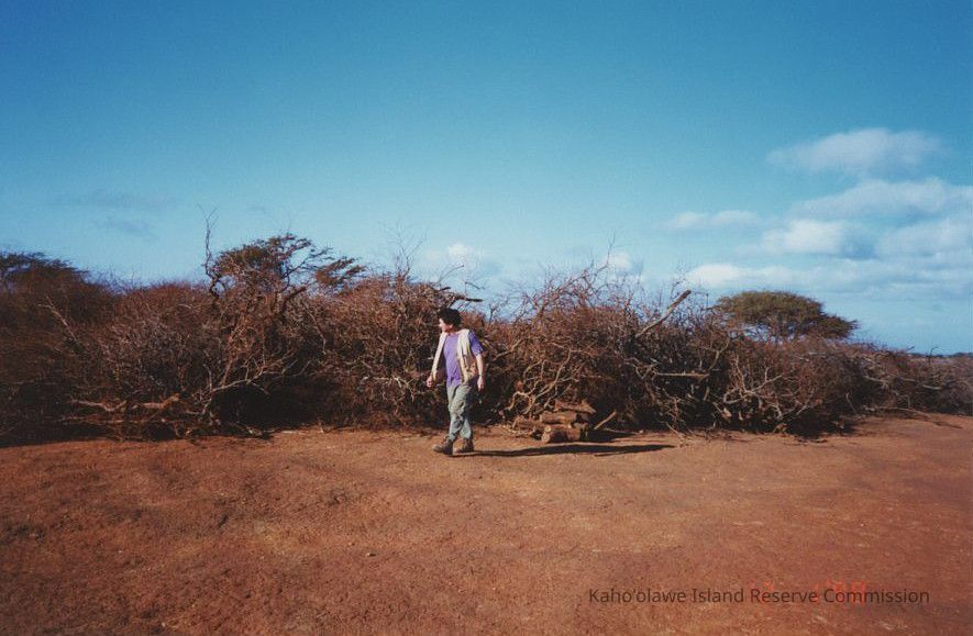 Photo of Paul Higashino walking along brush piles, probably in the Lua 'O Kealialalo/Seagull area.Collection