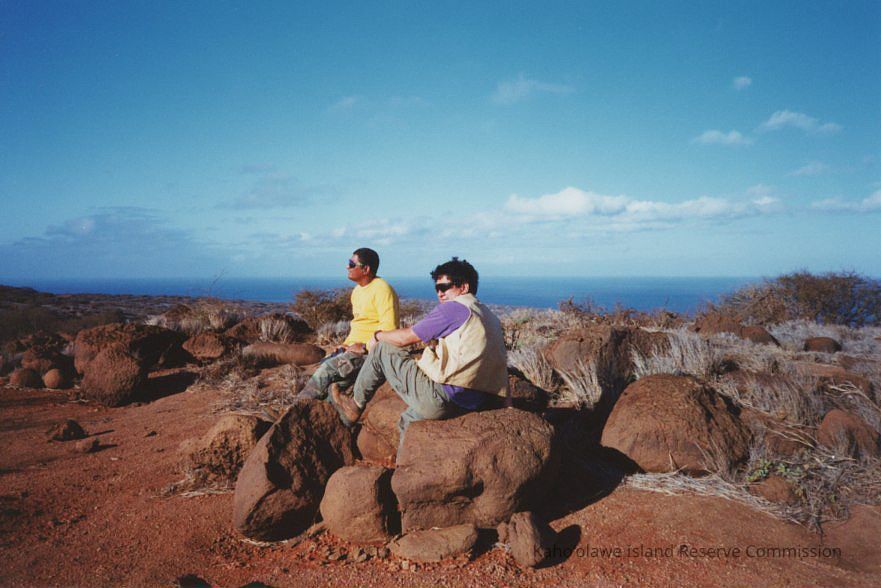 Photo of Paul Higashino and an unidentified man sitting on boulders, possibly in the Lua 'O Kealialalo/Seagull area.Collection