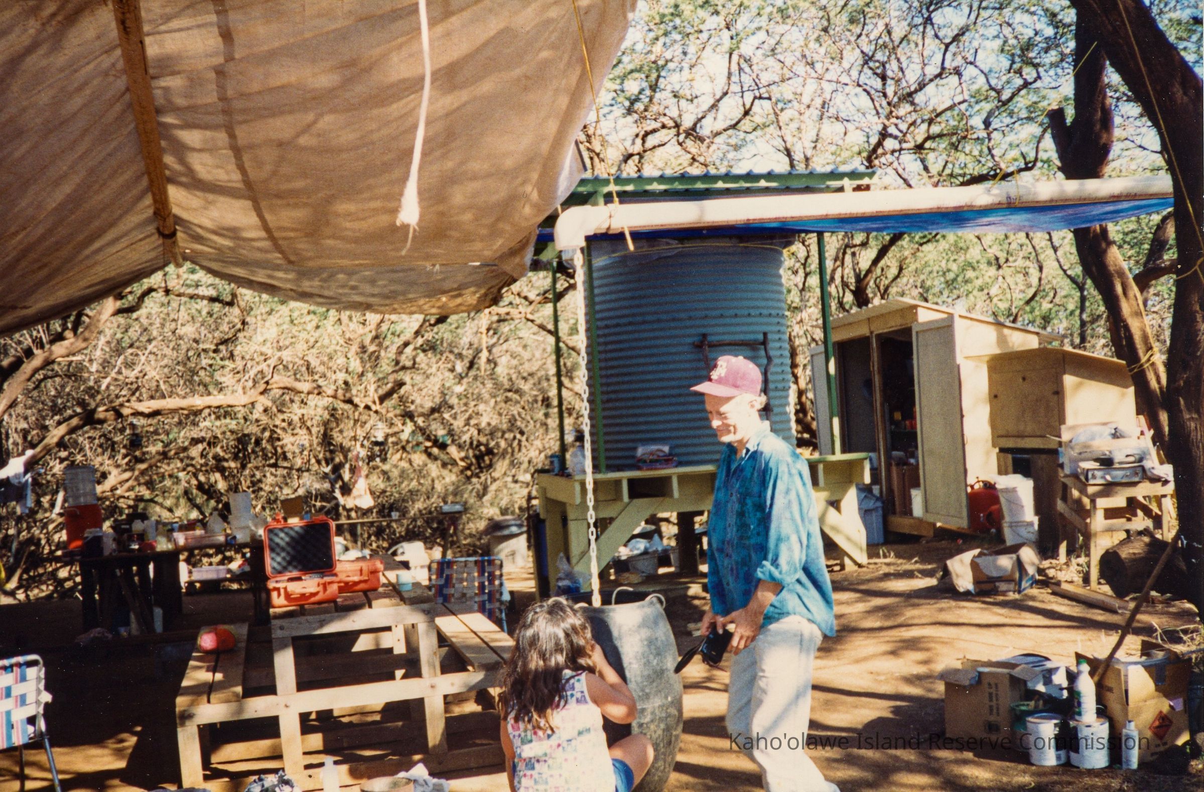 Color photo of an unidentified kāne (man) and keiki (child) at a camp site. There is a water catchment structure and wooden shed in the background. This photo was probably taken at Hakioawa.