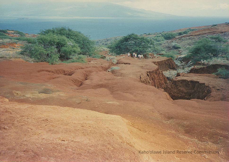 Color photo taken at a distance of several unidentified people at the edge of a gully in an unidentified area. Gully faces Maui.