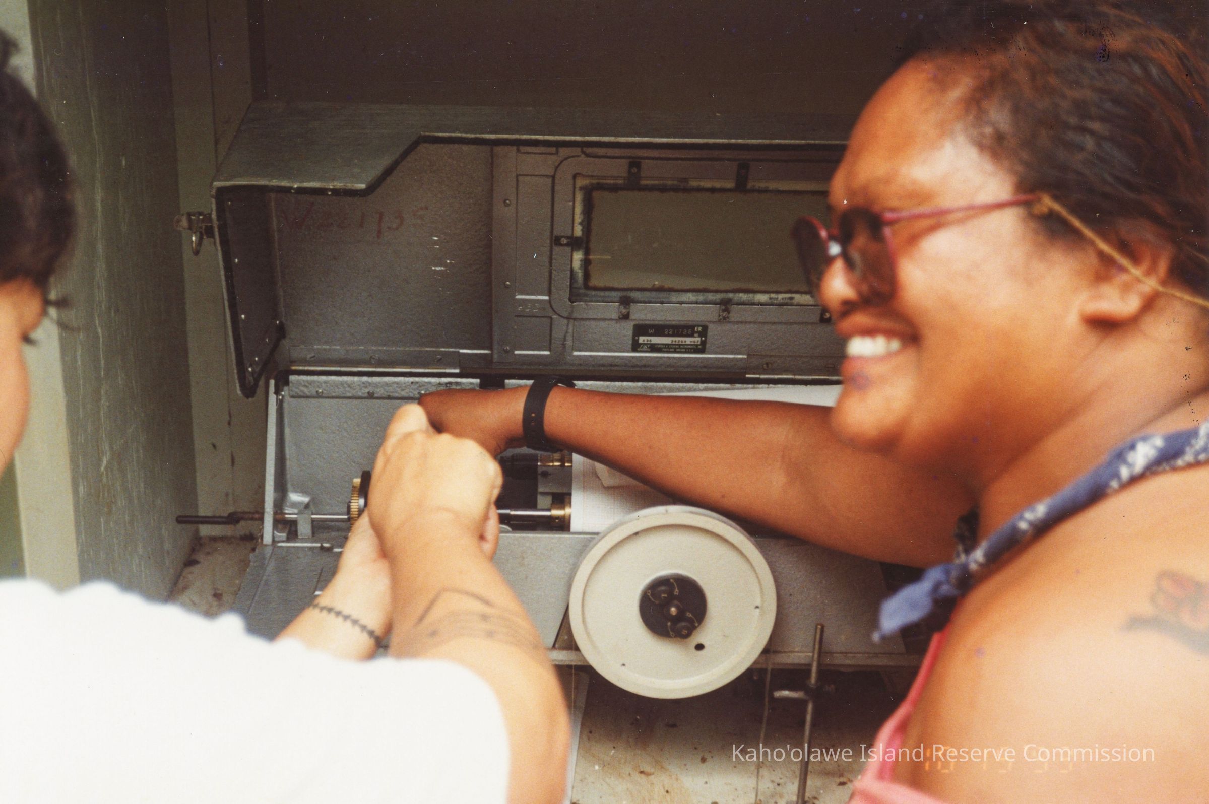 Two unidentified people changing the clocks in a water gage. Photo possibly taken in Hakioawa, Kaho'olawe.