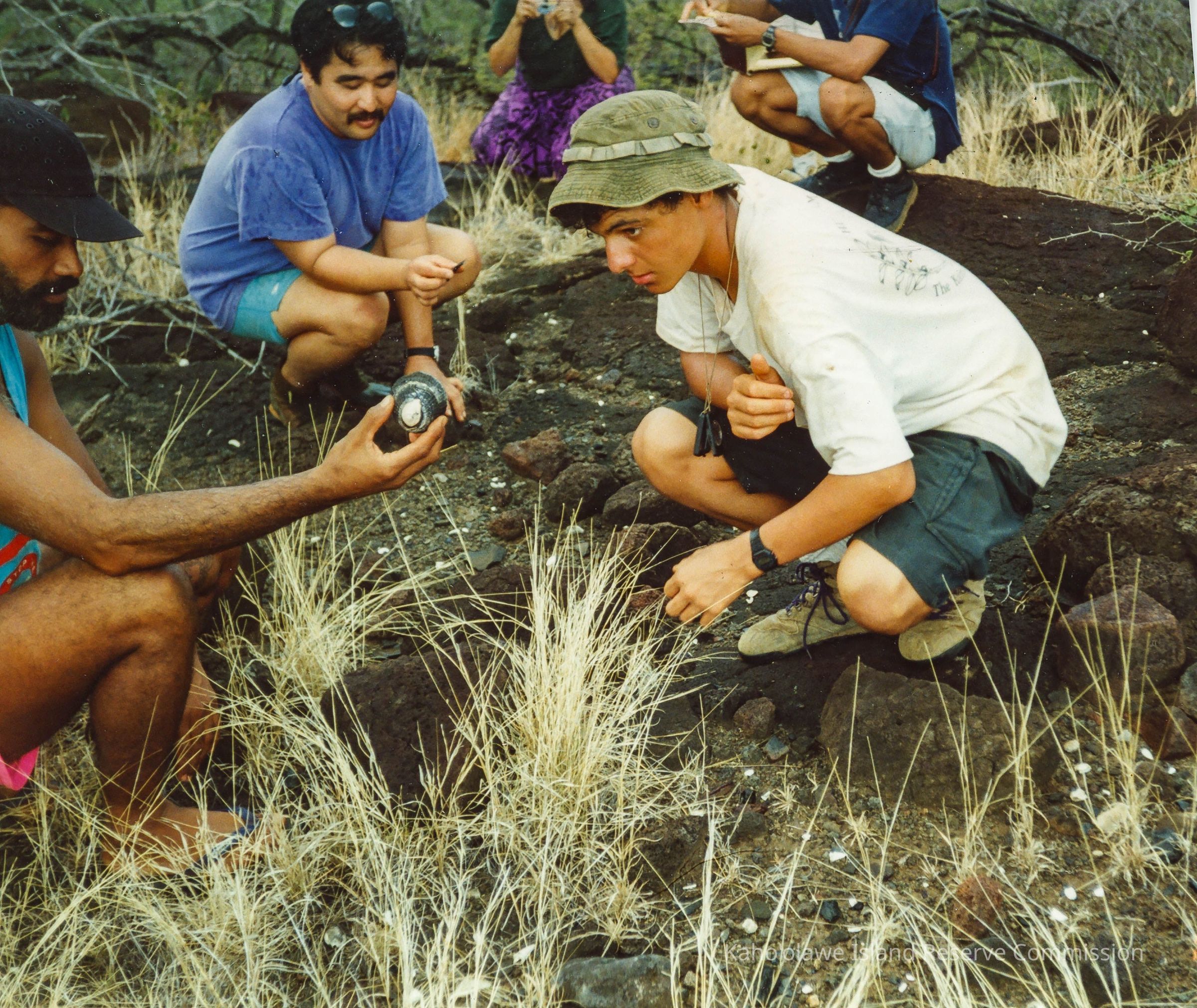 A cropped, color photograph of a group of people examining a potential archaeological site. Three men are in the foreground. Two unidentified person are examining an unidentified object one is holding. Burt Sakada is in the background examining another object. A woman is in the far background taking pictures and a man is writing notes.Photograph Details