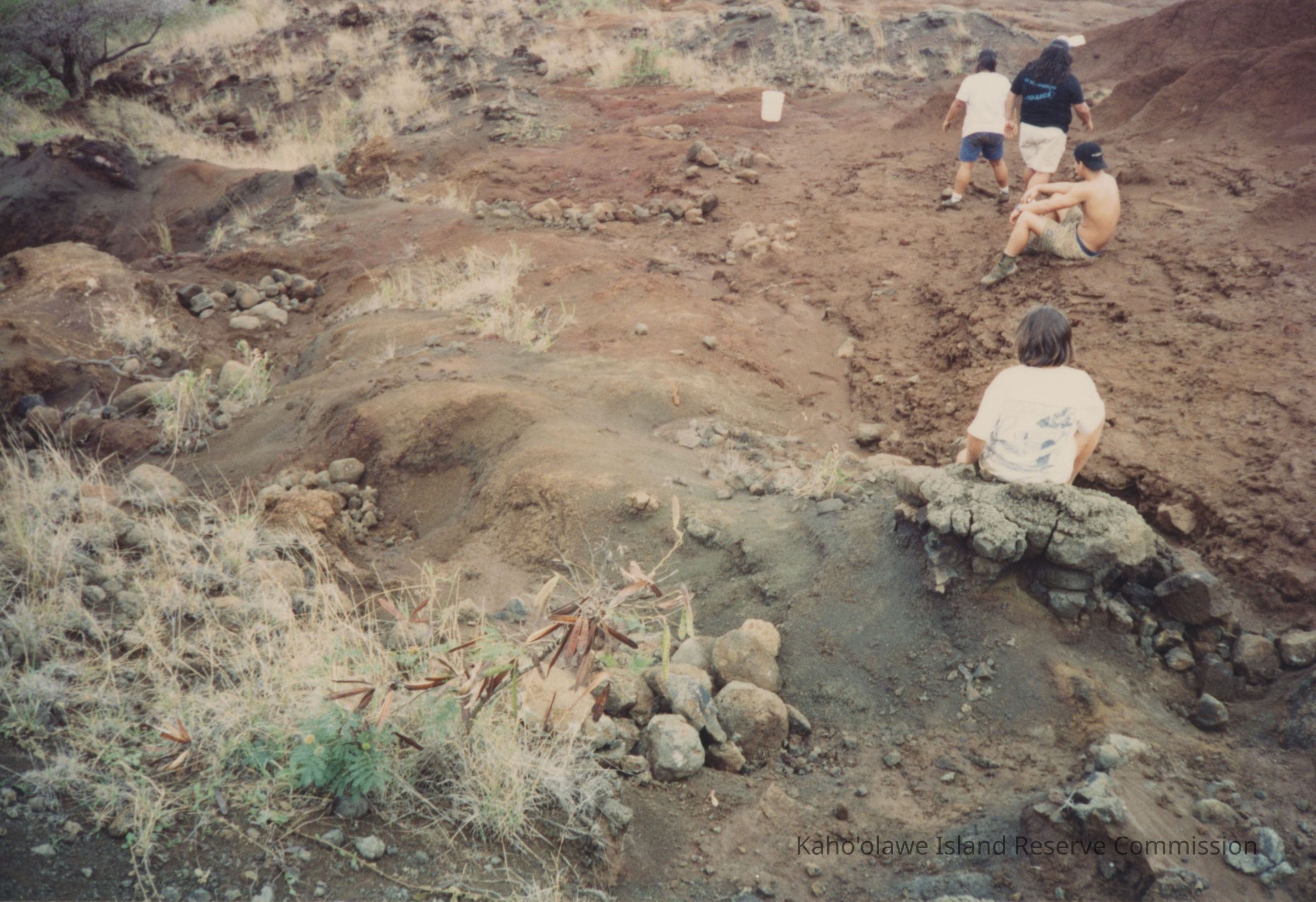 The image shows several individuals sitting and exploring a dry, rocky streambed with sparse vegetation and scattered rocks.