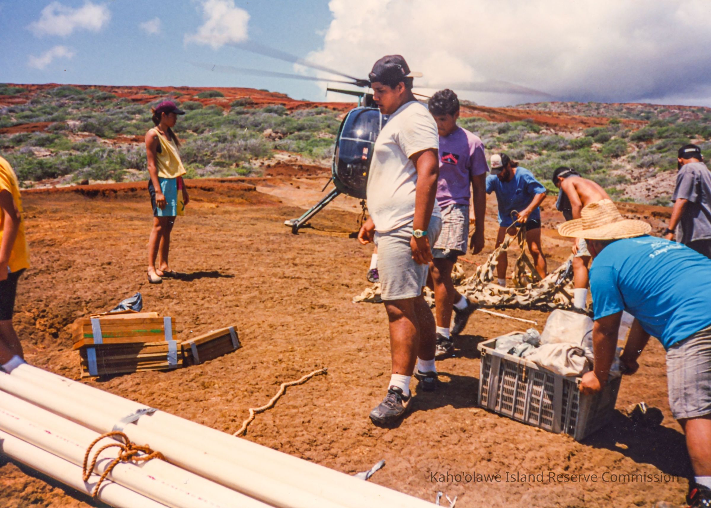 Color photo of a group of unknown people gathering construction materials and harnesses off of hardpan terrain. There is a helicopter in the background. This photo was probably taken at Wailuna in Hakioawa 'Ili.
