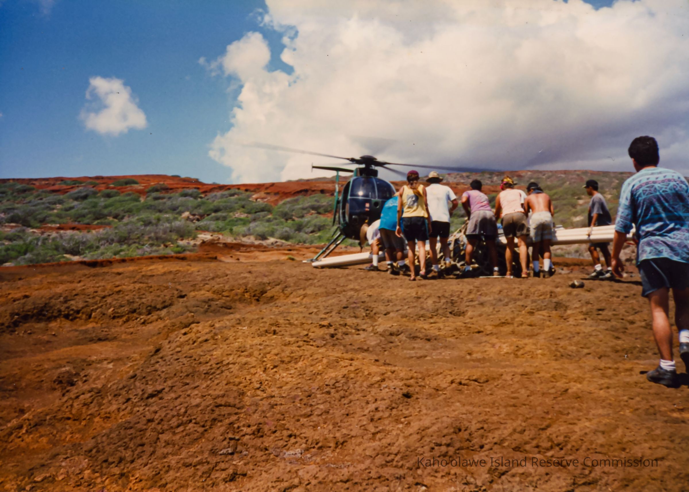 Several people are gathered around a helicopter to unload pipes on a red, rocky terrain under a cloudy sky.