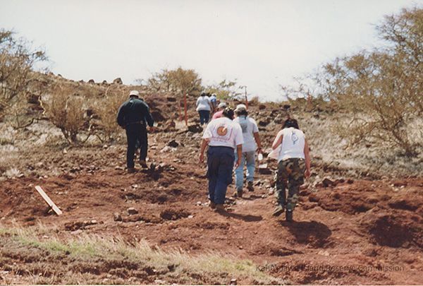 Color photo of a group of unidentified people walking on Kaho'olawe.