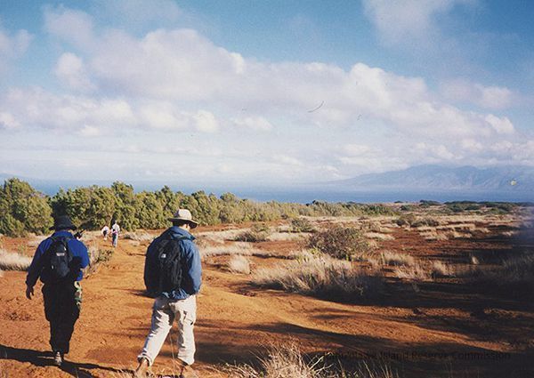 Color photo of a group of unidentified people hiking on hardpan in an unidentified area with treeline on one side and west Maui in the background.Collection