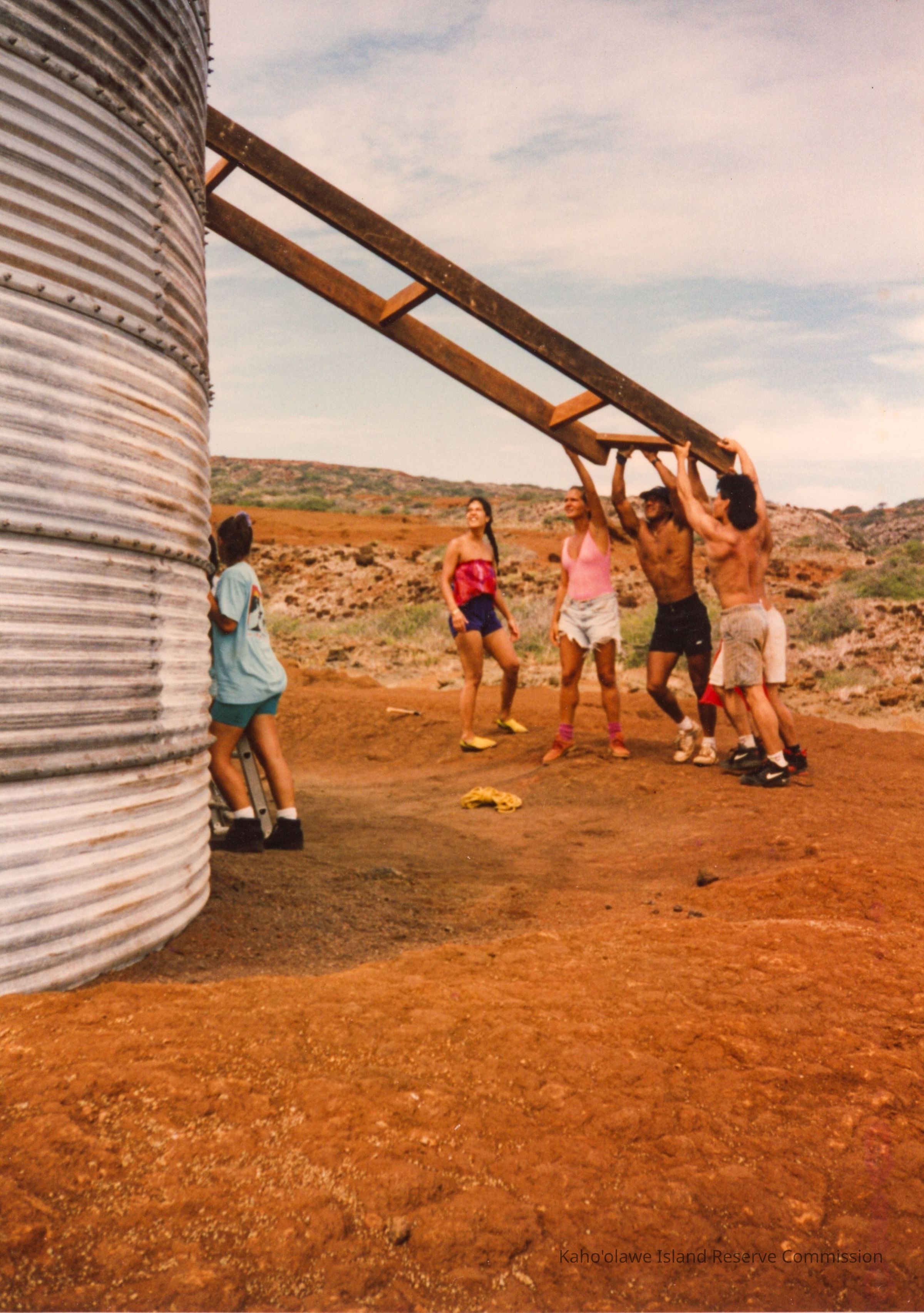 In this image, people are outdoors, cooperating to lift a heavy wooden structure, to the top of a metal water catchment structure.