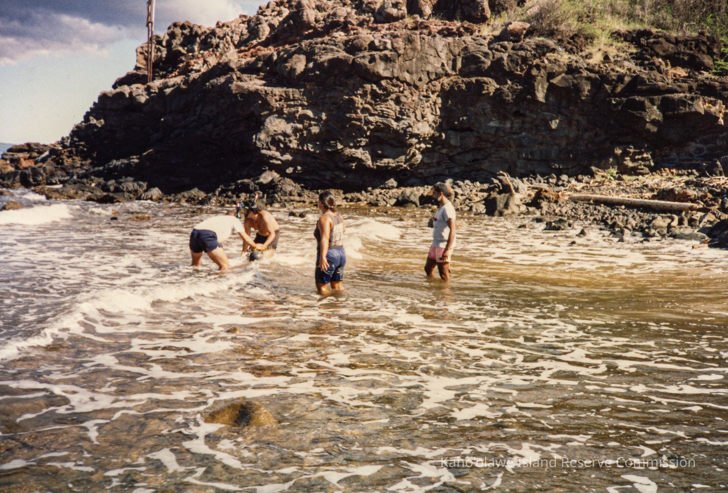 Color photo of four unidentified people standing in shallow waters off shoreline. Two men appear to be handling a fishing net. This may have been taken at Hakioawa Beach.