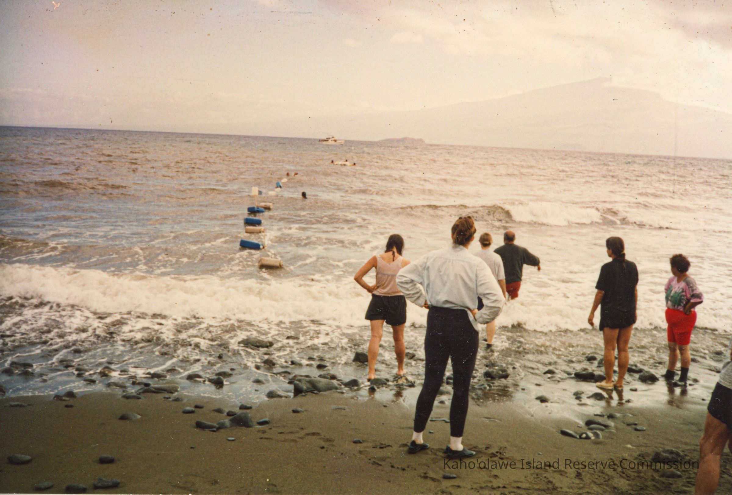 Color photo of several unidentified people on a beach (possibly Hakioawa) awaiting cargo. The cargo is being conveyed via tow line from a boat in the distance. Molokini and Haleakalā are in the far distance. The notation on the original photo album page notes: "October 31, 1993, Zodi broken. Gotta "Tow Line" Everone [sic]/Thing."Photograph Details