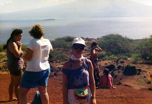 Color photo a group of unidentified people standing and sitting on hard pan with Molokini and Maui in the far background. Photo taken during Legal Aid Society (Moloka'i) access.
