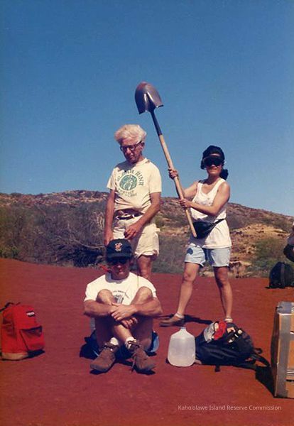 Color photo of an unidentified woman holding a shovel behind a unidentified standing man and an unidentified sitting man in front. Photo taken during Legal Aid Society (Moloka'i) access.