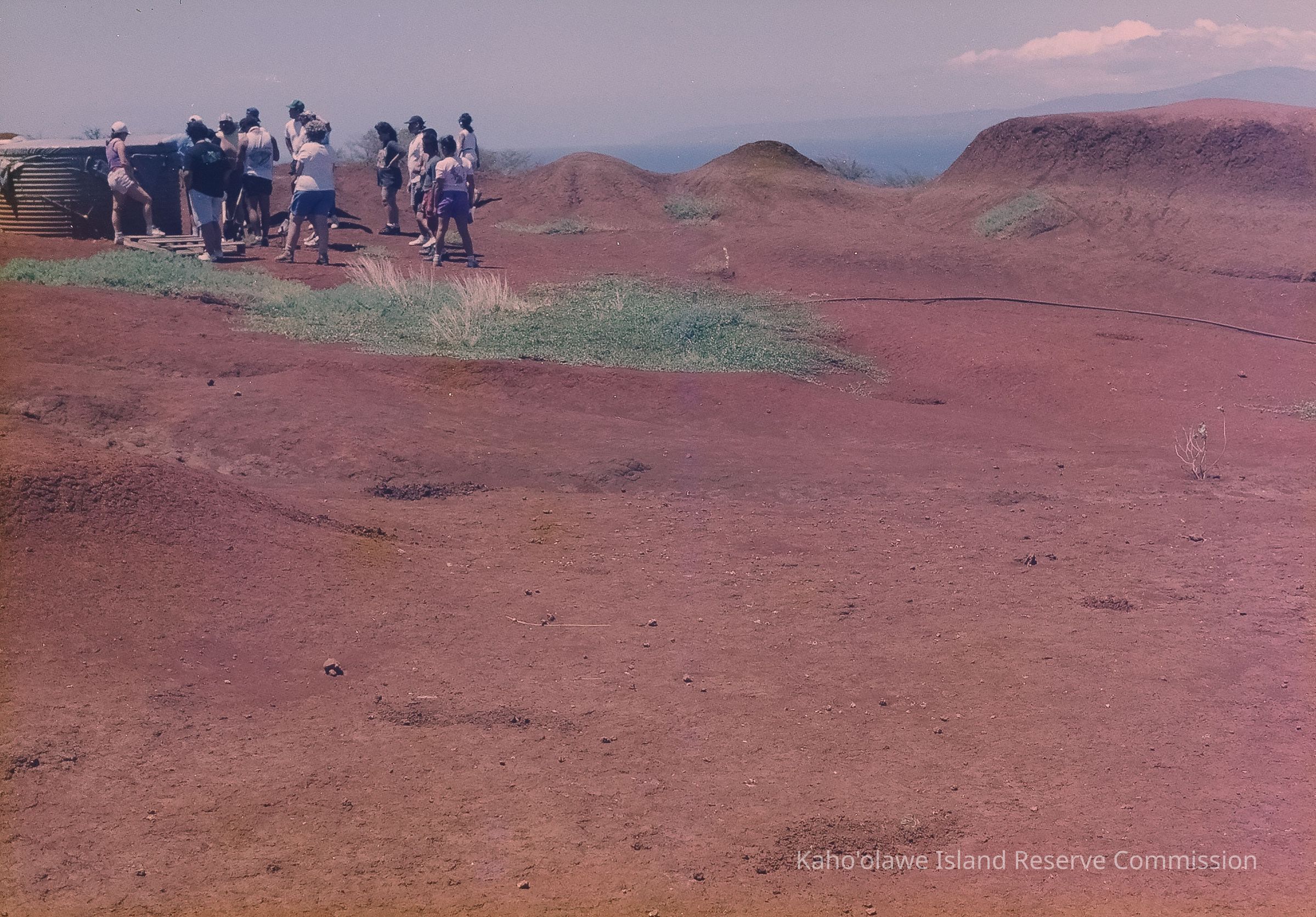 Color photo of hardpan terrain with a group of unidentified people standing near a water catchment tank in the background. There is a planting in the foreground.