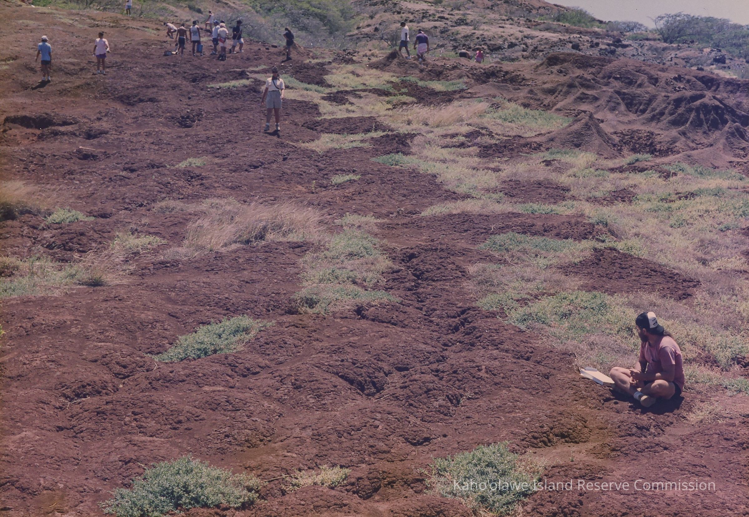 The photo showcases multiple people exploring a rugged, reddish terrain, with an individual sitting on the hardpan in the foreground.
