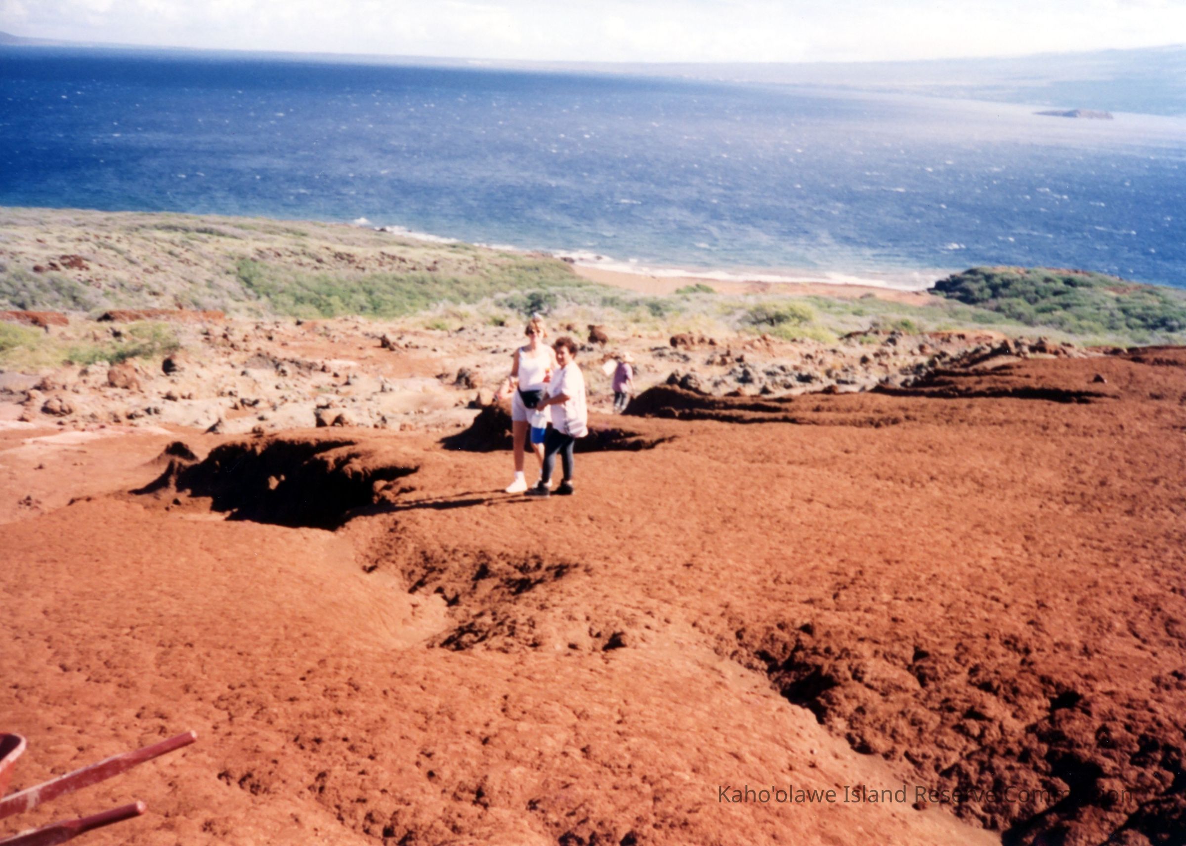 A group of people walks on a reddish-brown hardpan terrain near the ocean, surrounded by rugged, rocky landscapes and sparse vegetation.