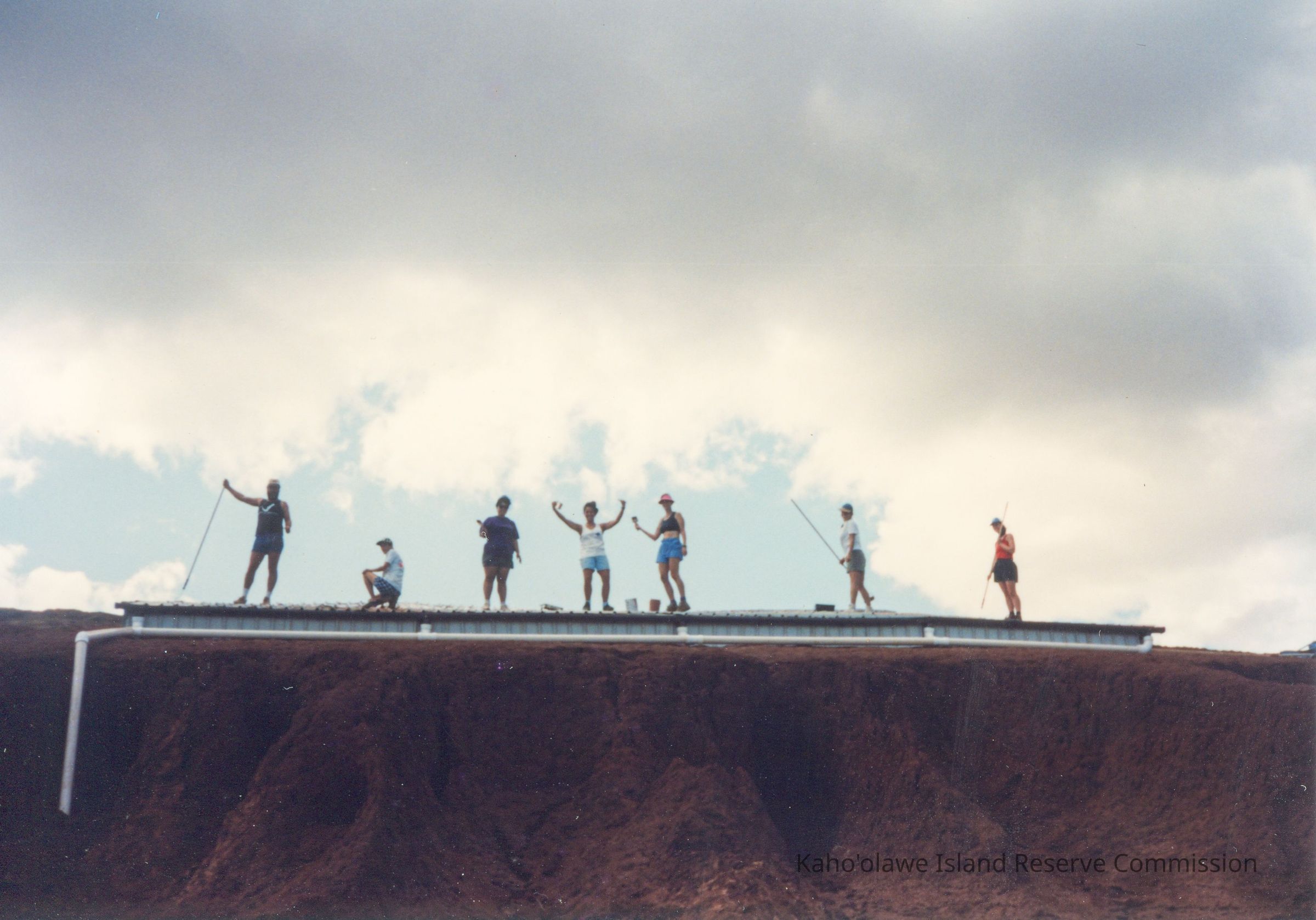 Color photo of a group of unidentified people standing and kneeling on top of a corrugated metal water catchment structure.