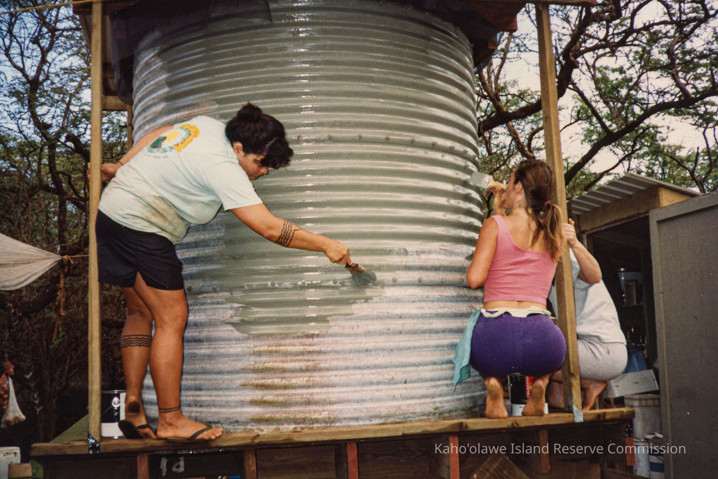 Three people are collaboratively painting a large corrugated metal tank for water storage, surrounded by trees and construction materials.