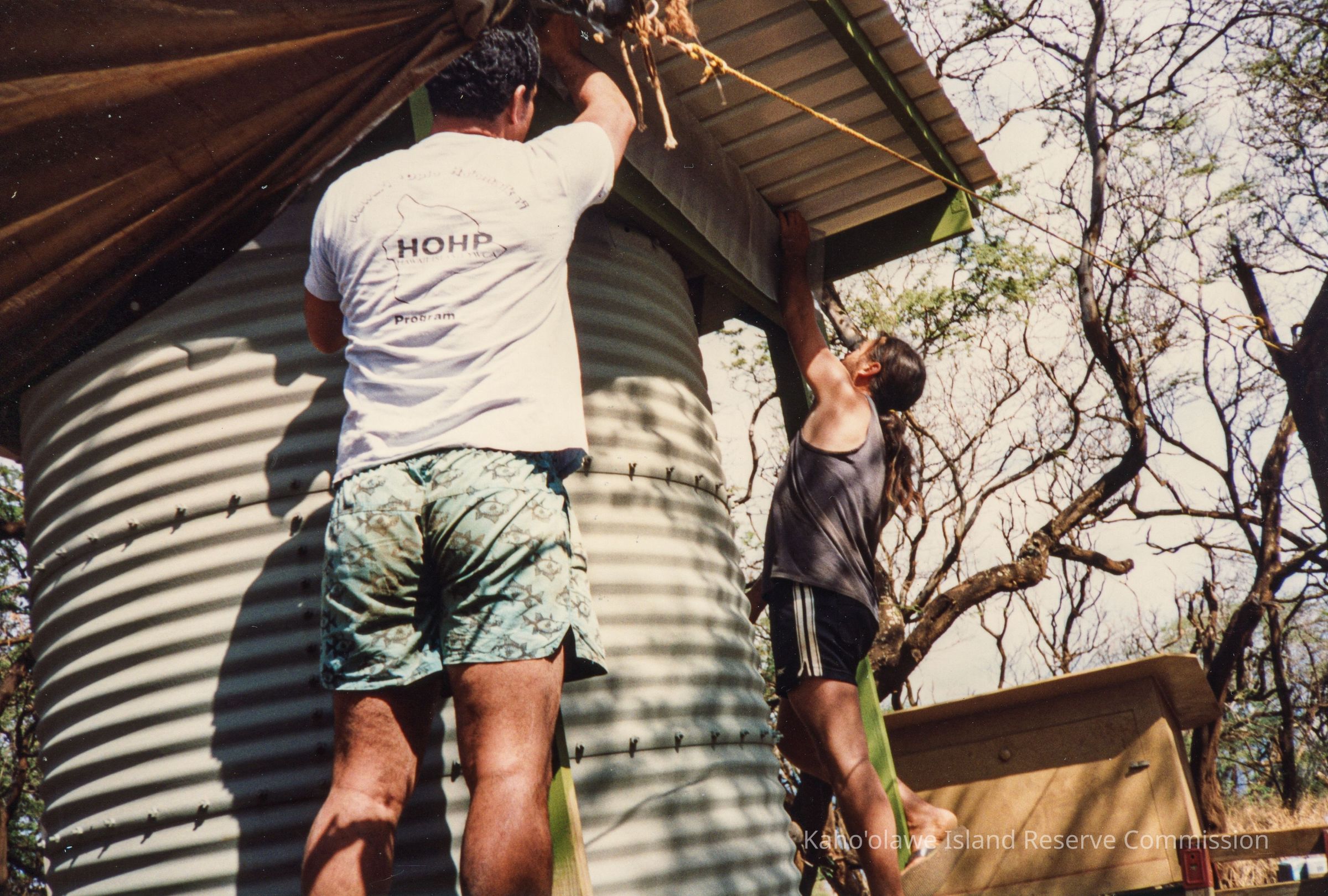 Two individuals are constructing a water stroage system, attaching roofing material to a large cylindrical tank.