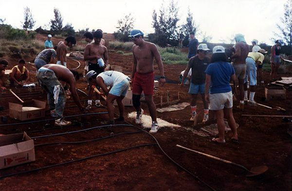 Color photo of a group of people (possibly from the Protect Kaho'olawe 'Ohana) planting and irrigating on the hard pan.