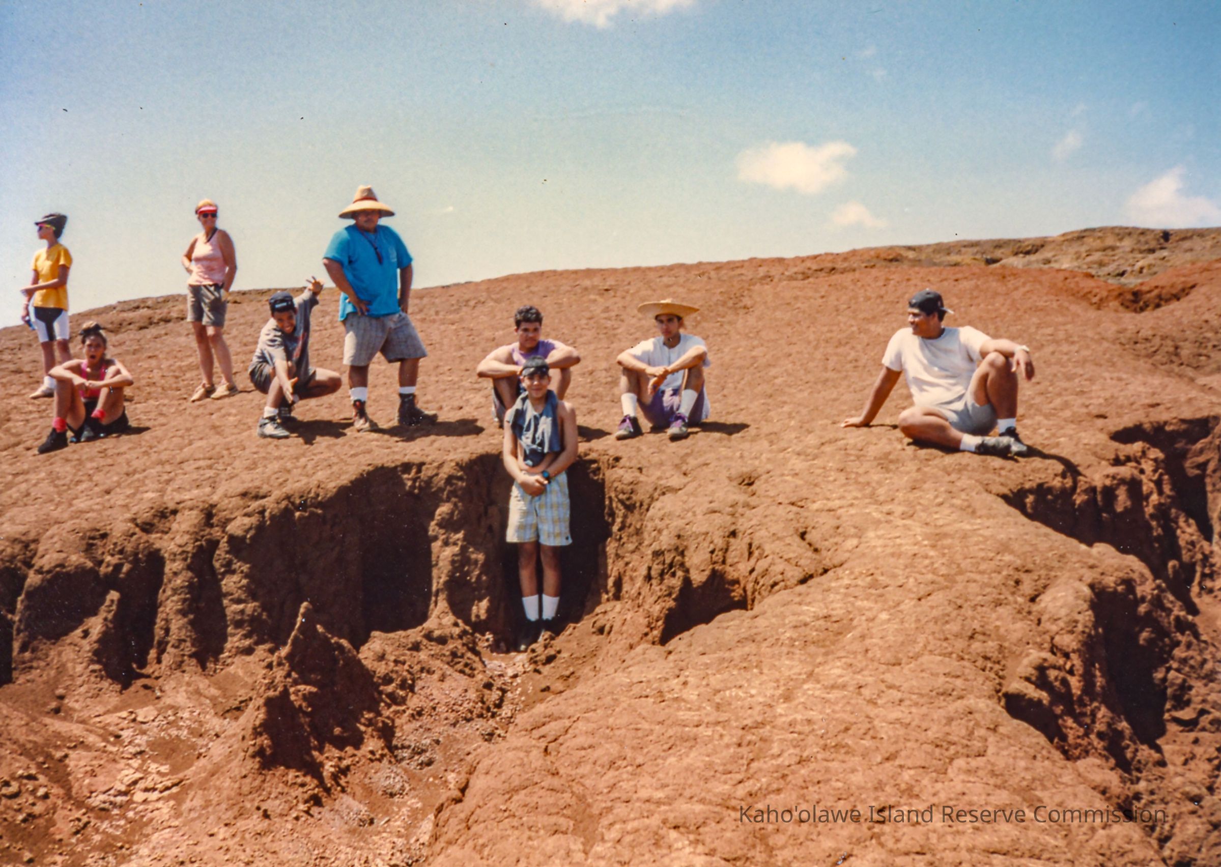 The image shows a group of people standing and sitting on a rugged, reddish-brown terrain under a clear blue sky.