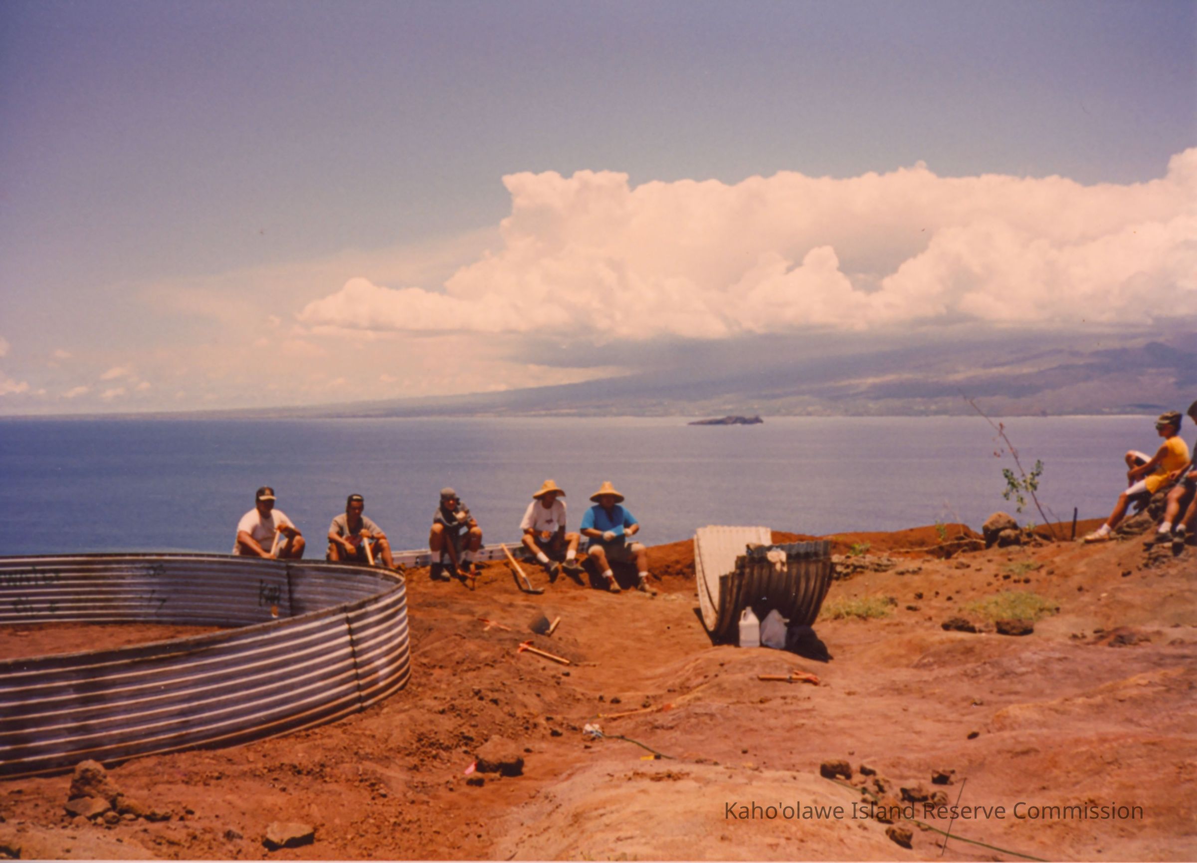 Color photo of a group of unidentified people sitting on hardpan cliff edge behind the foundation of a metal water catchment structure. Metal construction material sits to the right and a couple of people sitting farther right.