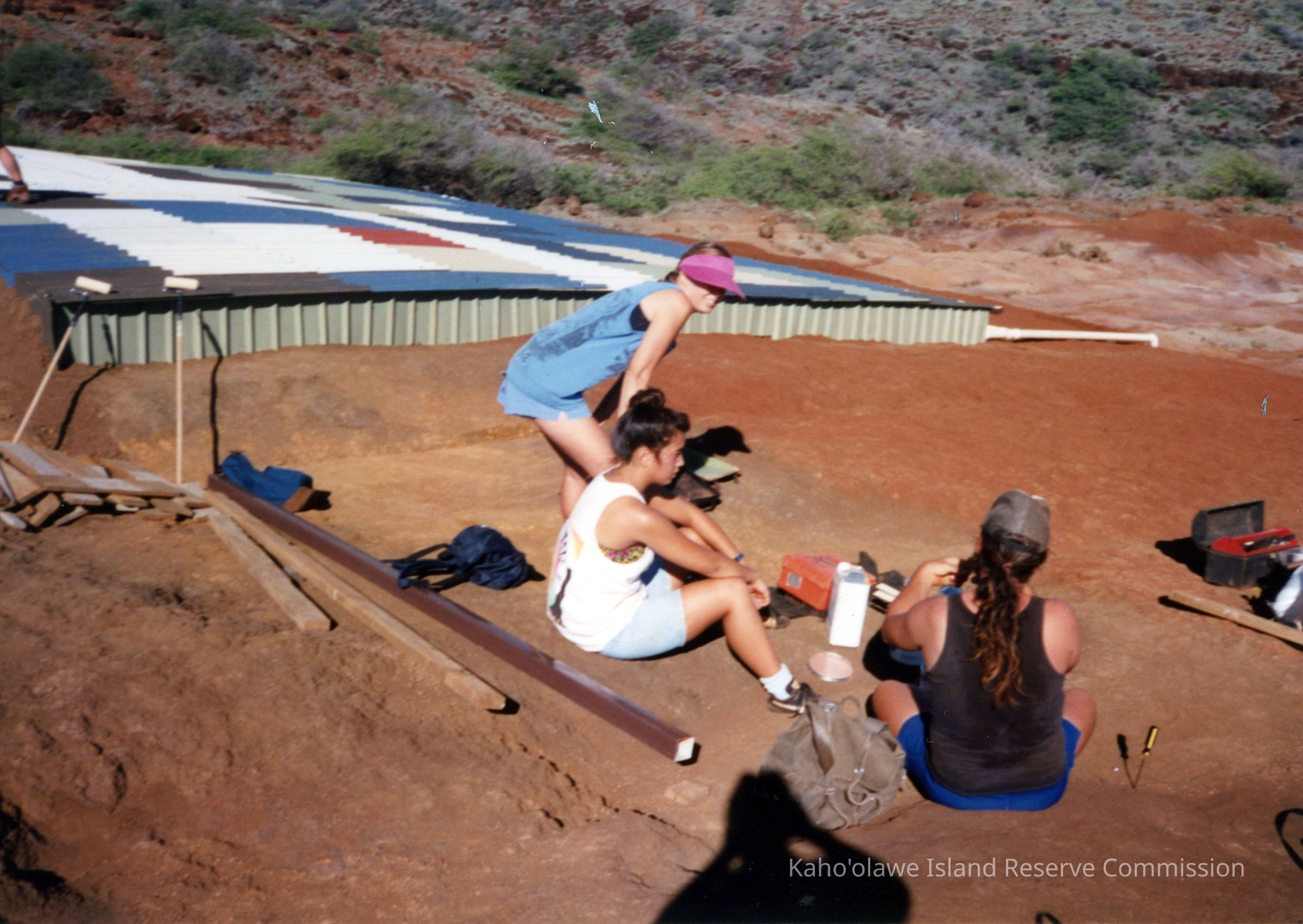 Three unidentified people near metal water catchment structure. One person is kneeling down and the other two are sitting on hardpan terrain. There is construction material nearby.