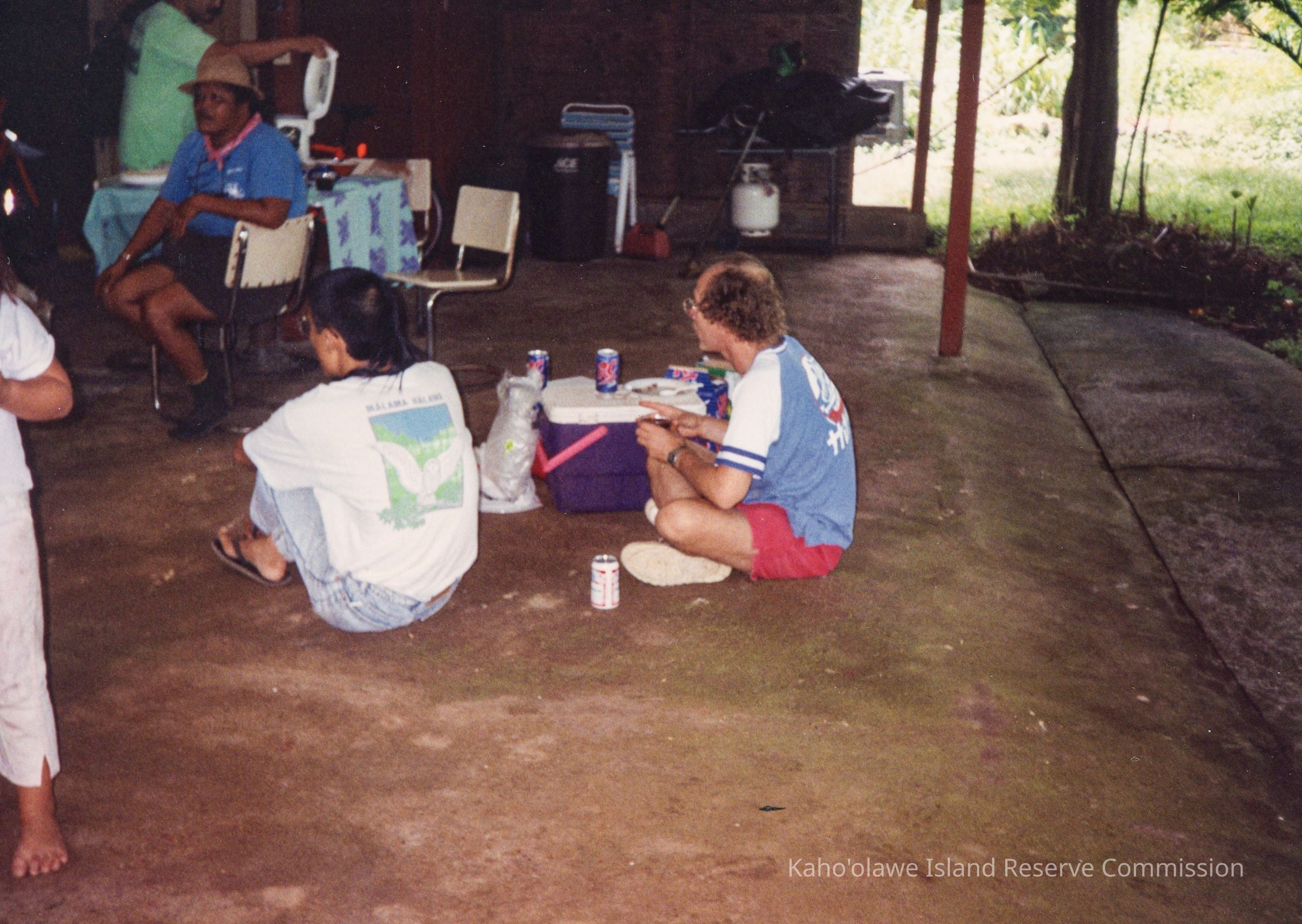 Color photograph of a group of unidentified people sitting on the floor and chairs under a shelter. This photo was probably taken at Paul Higashino's residence in Waihe'e.