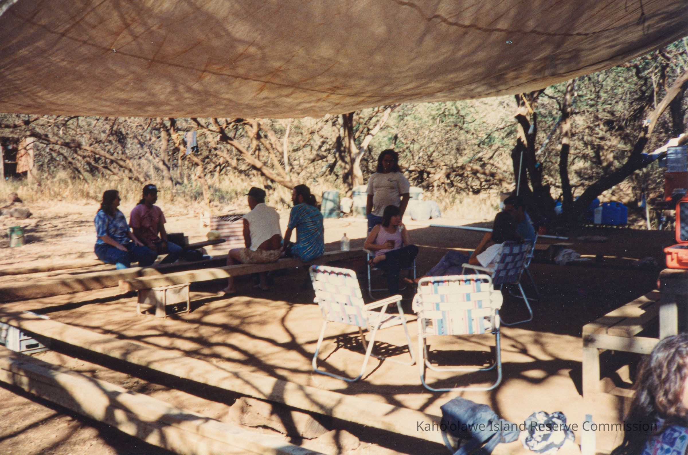 Color photo of a group of unidentified people sitting on benches and chairs with one person standing underneath a canopy made of tarp. This phot may have been taken in Hakioawa.Photograph Details