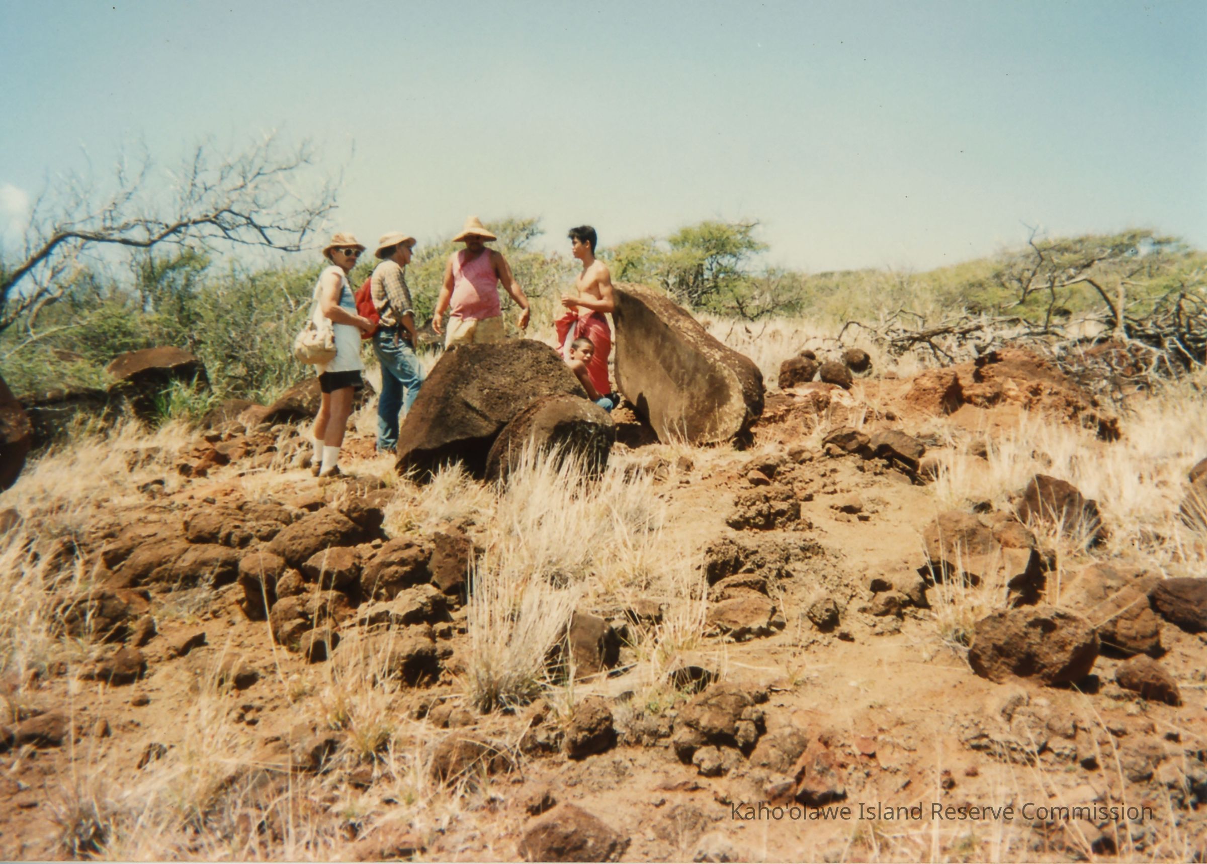 Color photo of a small group of unidentified people standing next to a rock with petroglyphs (ki'i pōhaku). Photo was taken from a distance.