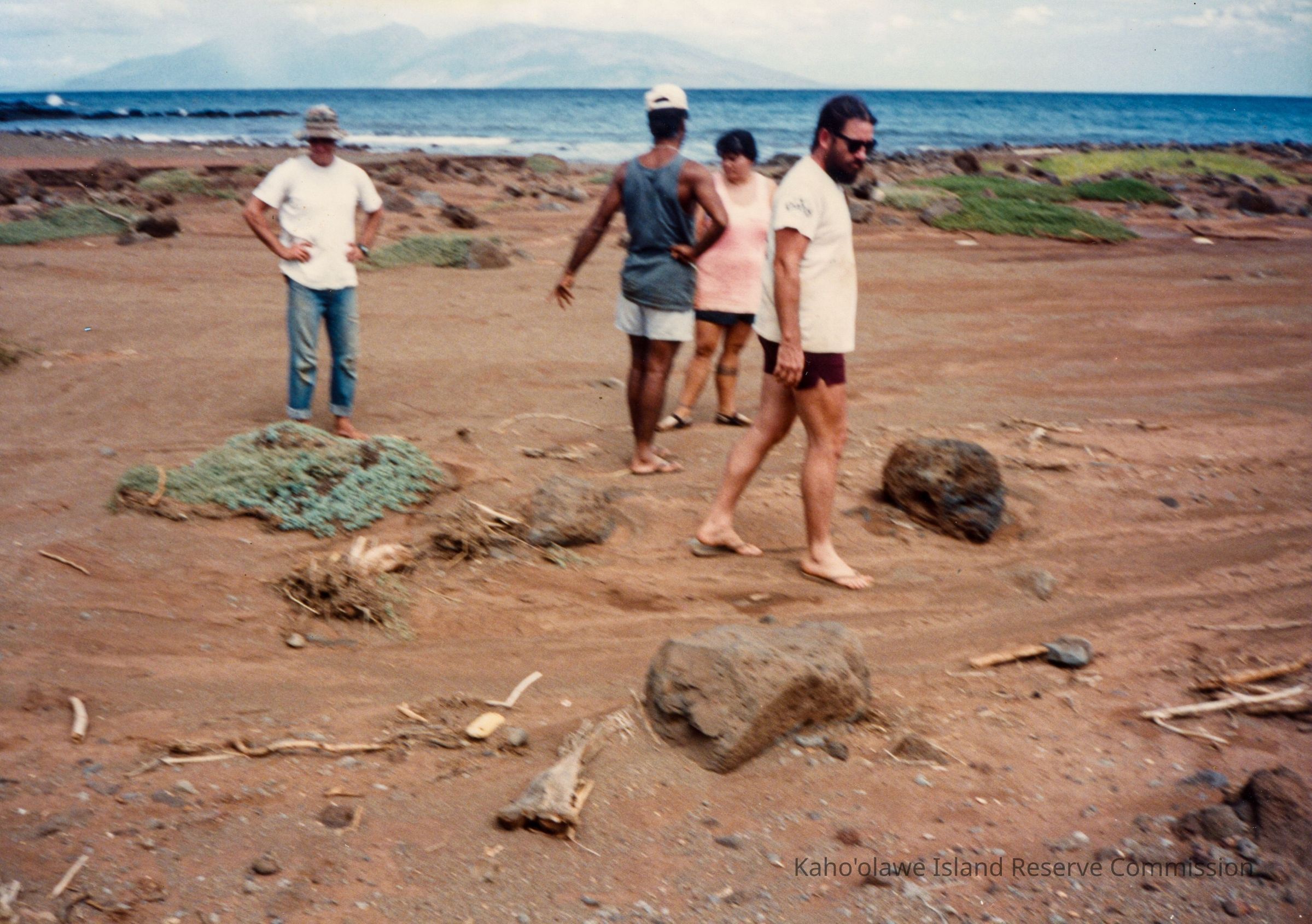 A rather blurry photograph of a group of unidentified people stand and talking on hardpan terrain with the ocean, rocky coastline and Maui in the far background.