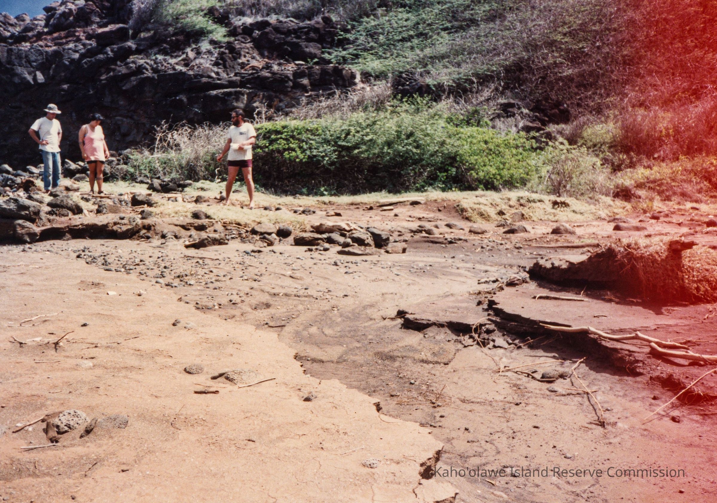 Color photograph of three unidentified people standing on a shallow sandy ledge above a rocky hardpan area which may have been a dried up streambed. Image is partially overexposed on the right hand side.