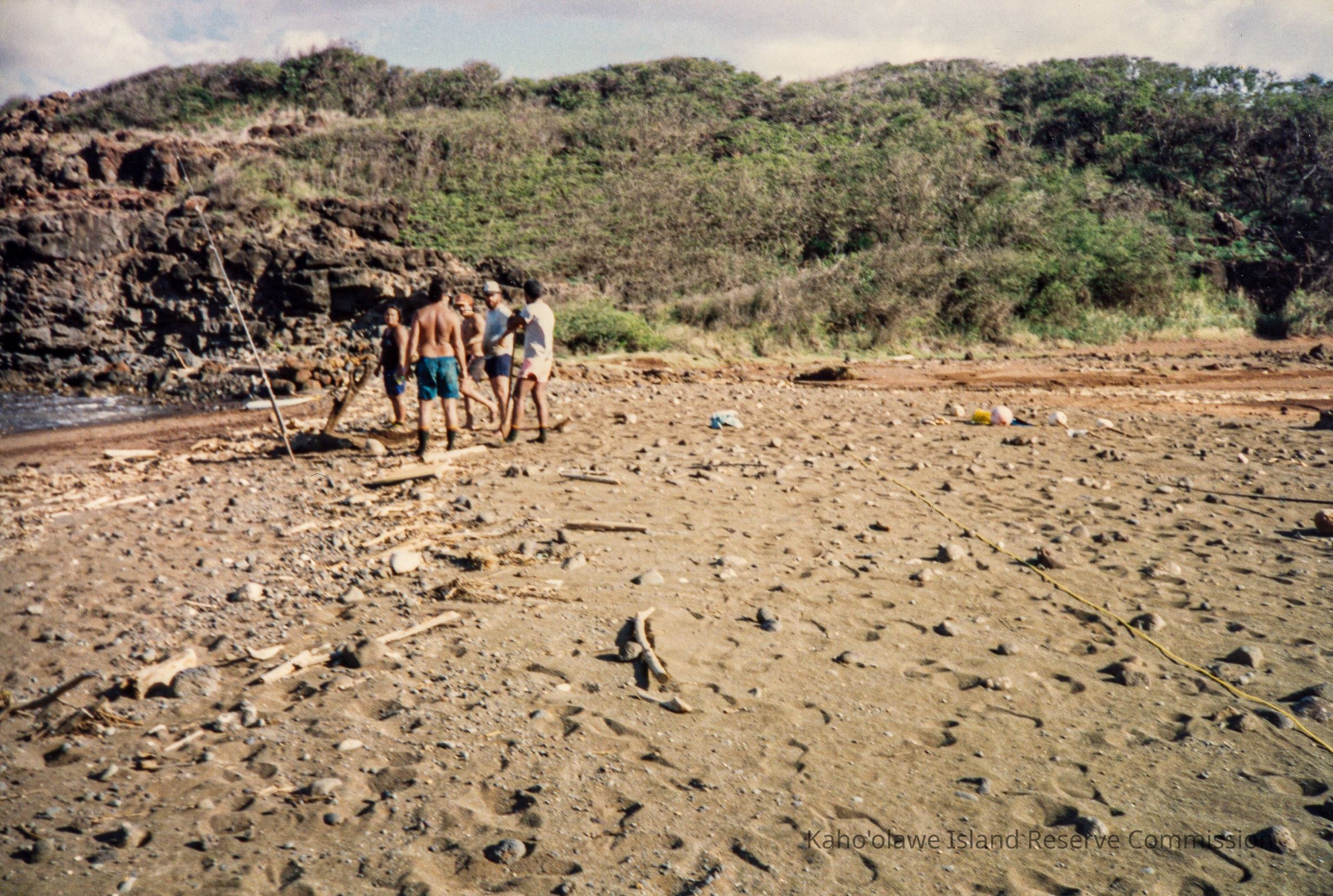 Color photo of a group of an unidentified people standing and talking near a long fishing pole at an unidentified beach (possibly Hakioawa Beach). The photo was taken at a distance.