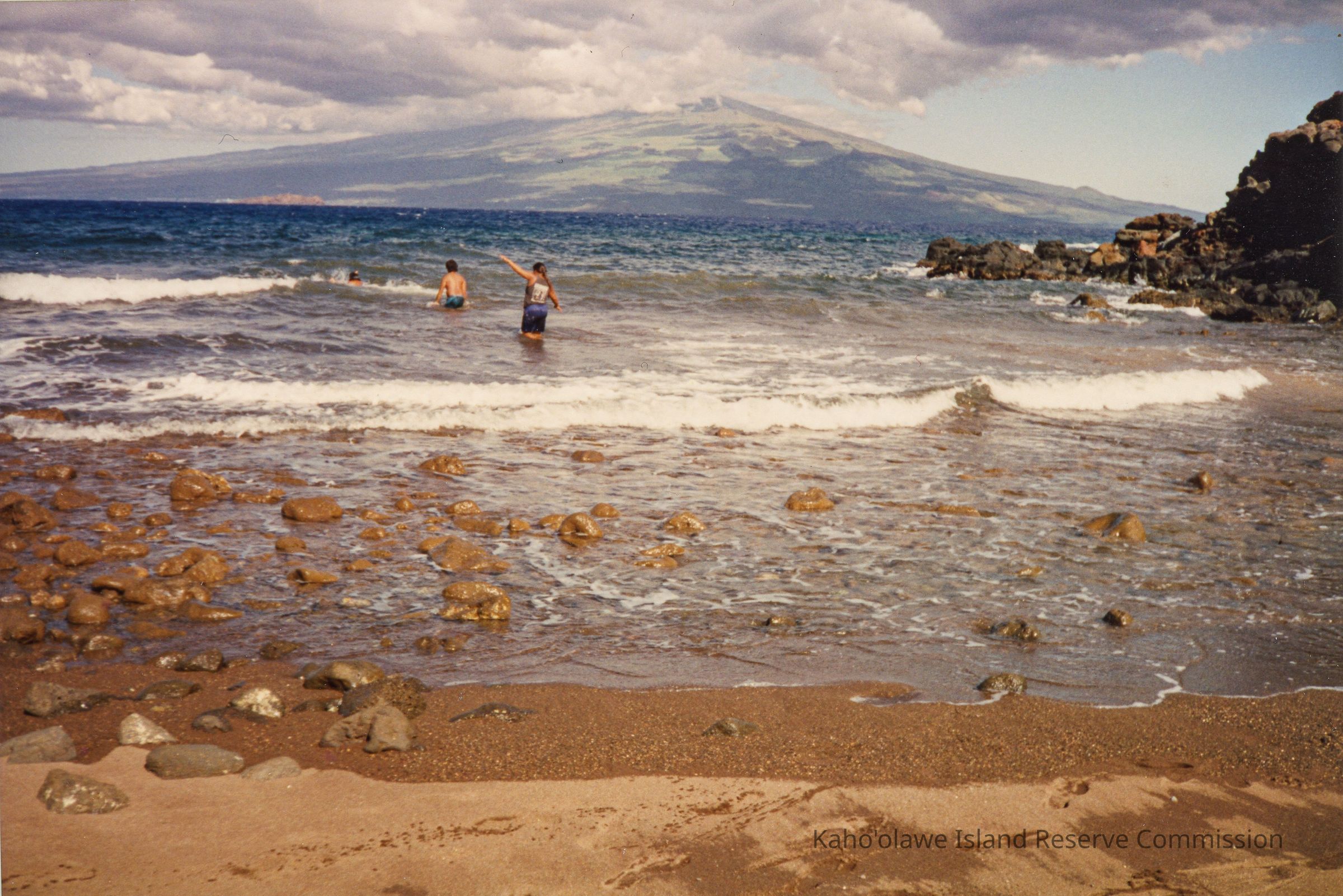 Three people wade through gentle waves on a rocky beach, with a scenic mountain in the background under a partly cloudy sky.