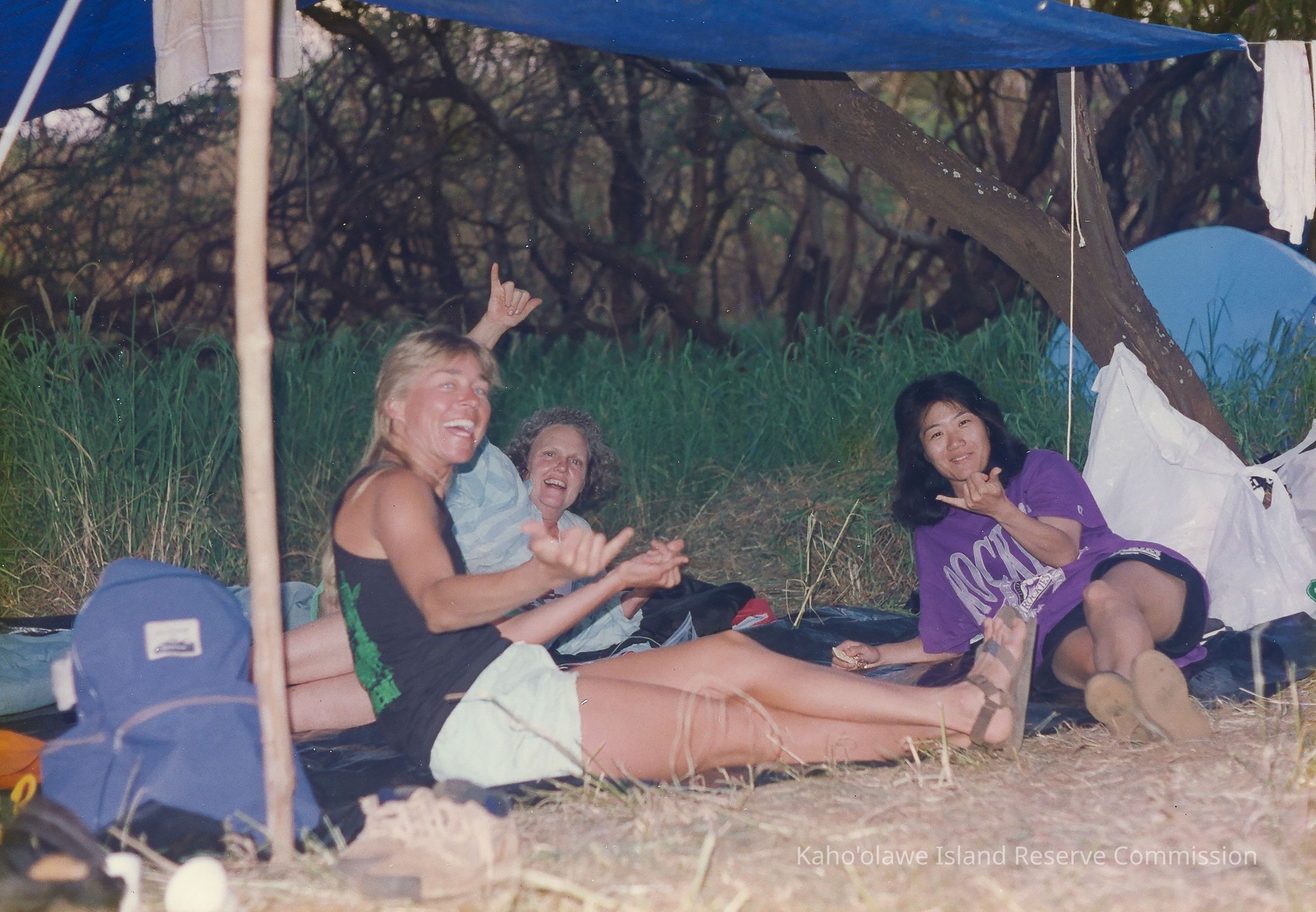 Three unidentified people relaxing under pitched tarp.