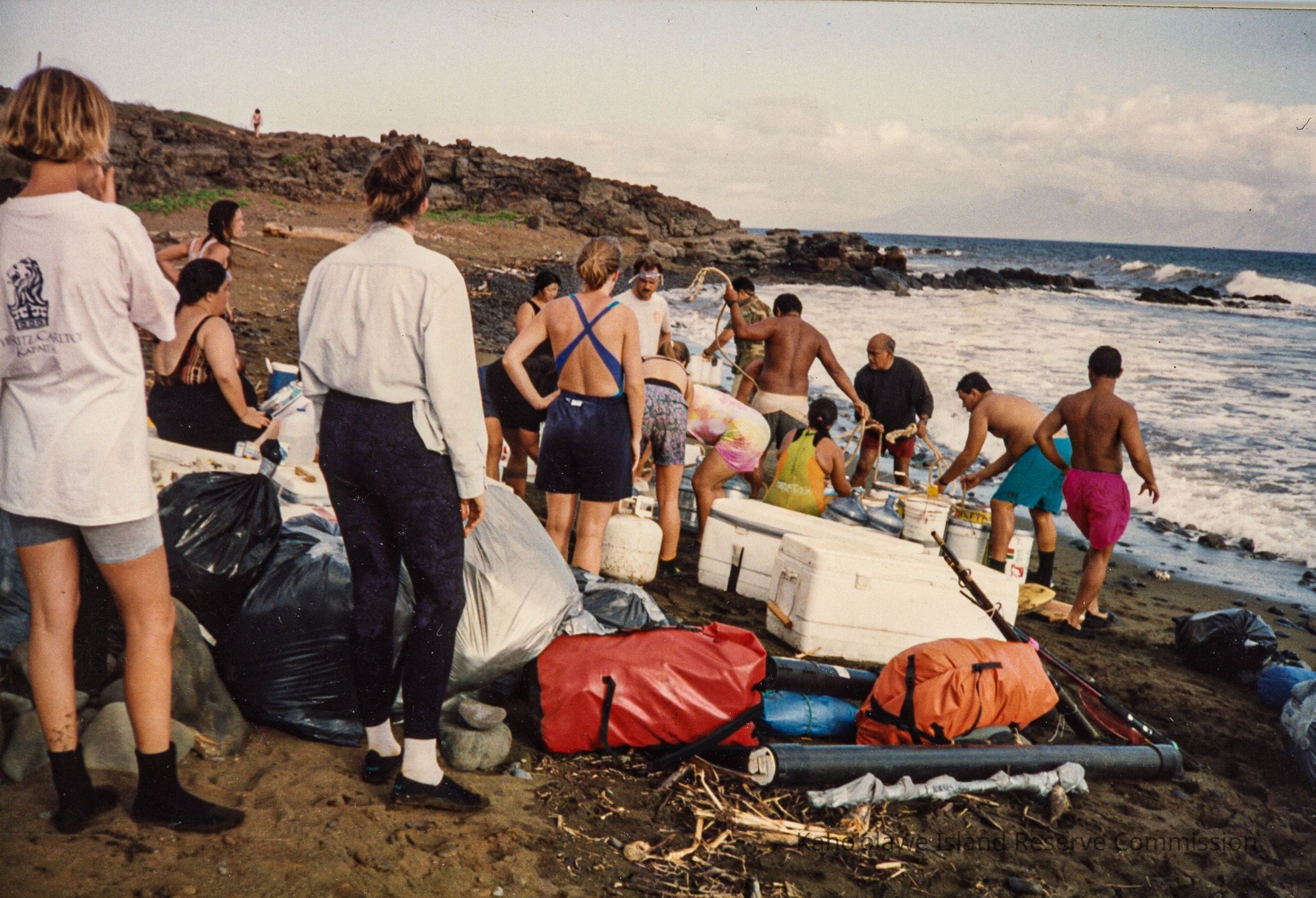 In the image, a group of people engage sorting equipment and supplies while standing near the water's edge.
