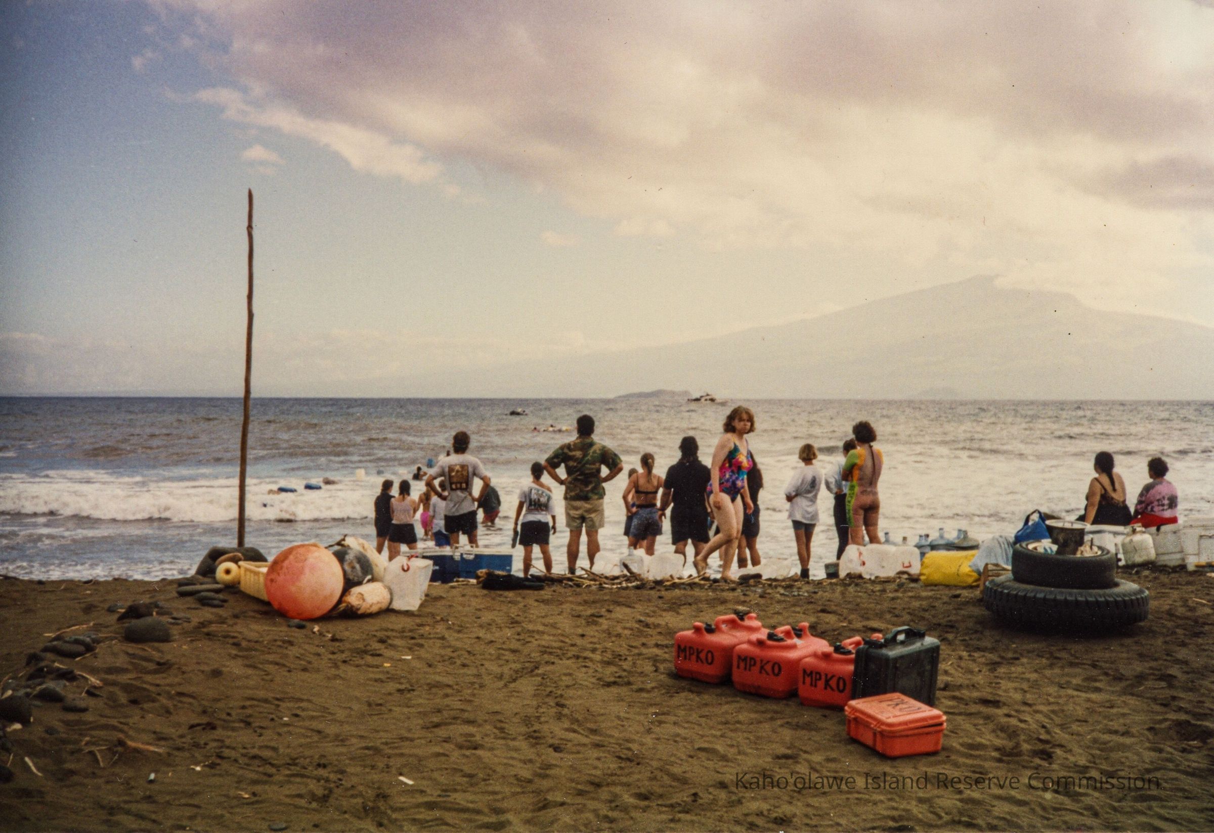 A group of unidentified people waiting along the shore of a bay (probably Hakioawa) for cargo being hauled by a tow line from a boat in the far distance. There are fuel containers, and other supplies in the foreground. Molokini and Haleakala in the distant background.Photograph Details