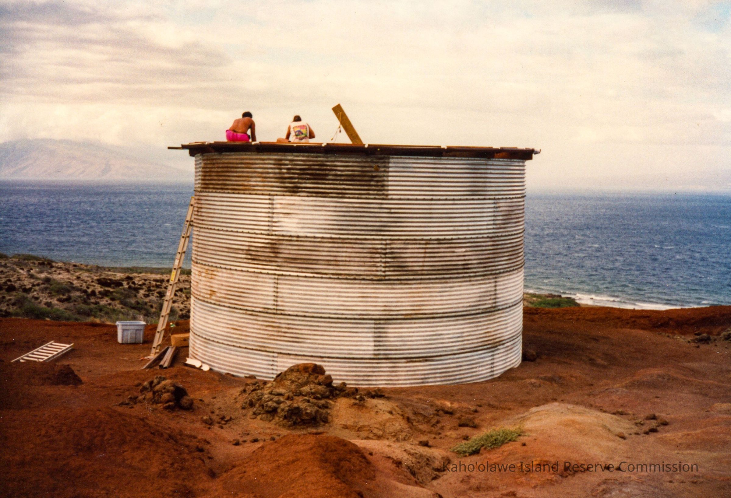 Color photo of two people, with their backs to the camera, sitting and working on top of a circular, corrugated metal water catchment structure on hardpan. There is a ladder leaning on the left of the structure and construction equipment are also to the left side of the structure. The ocean and the island of Maui is in the far background.Photograph Details