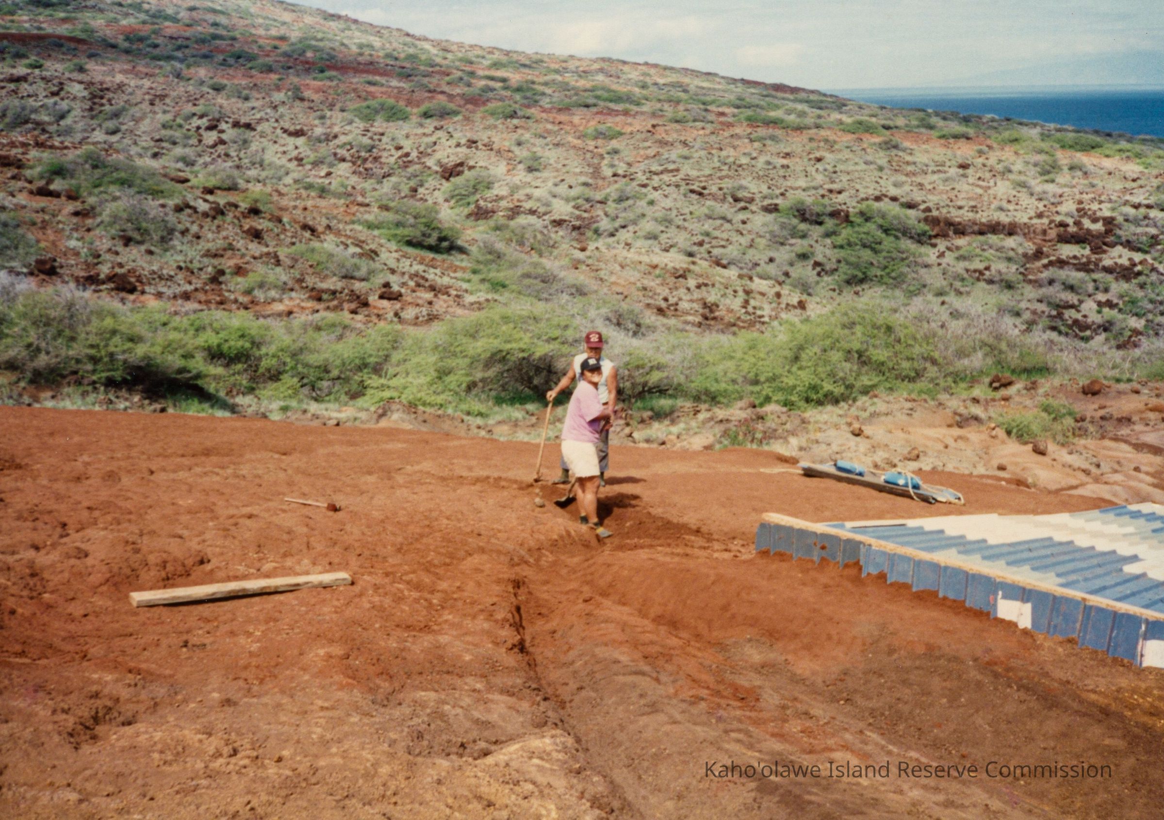 Color photograph of two unidentified people digging a trench in hardpan terrain next to a water catchment structure.