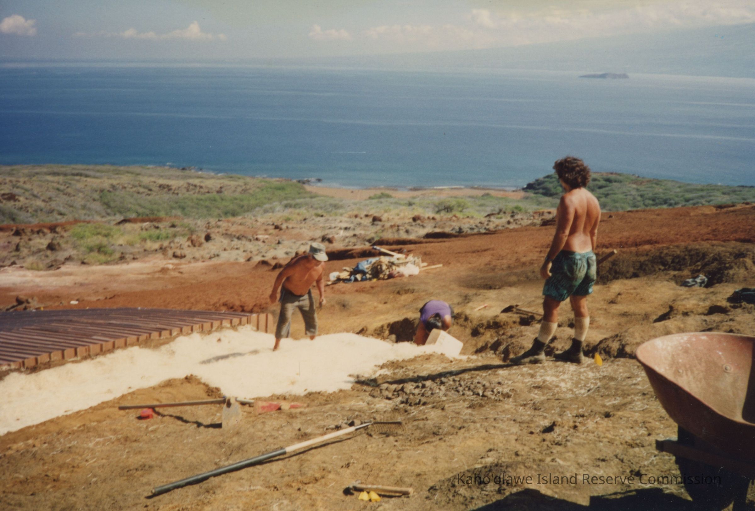 Color photograph of three unidentified people working at the end of a water catchment structure on hardpan terrain. One person is working in a hole. There is also matting next to the structure . The ocean, Molokini and part of Maui in the far background.Photograph Details