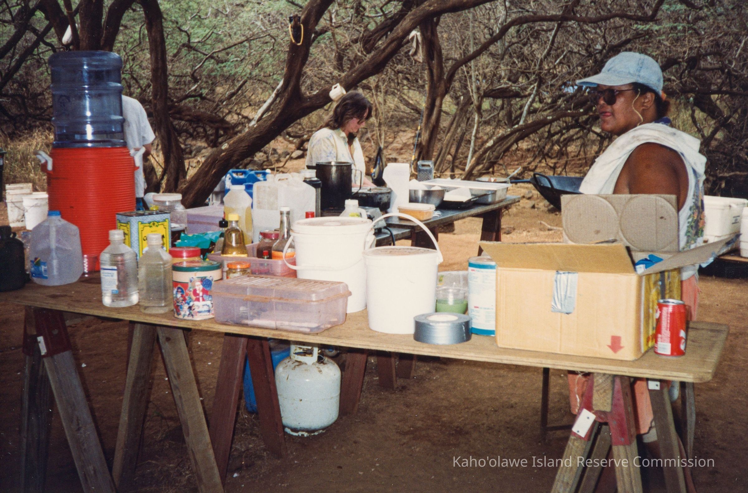 In the outdoor setting, two people engage near tables filled with various containers, jars, and a large water dispenser under curved tree branches.