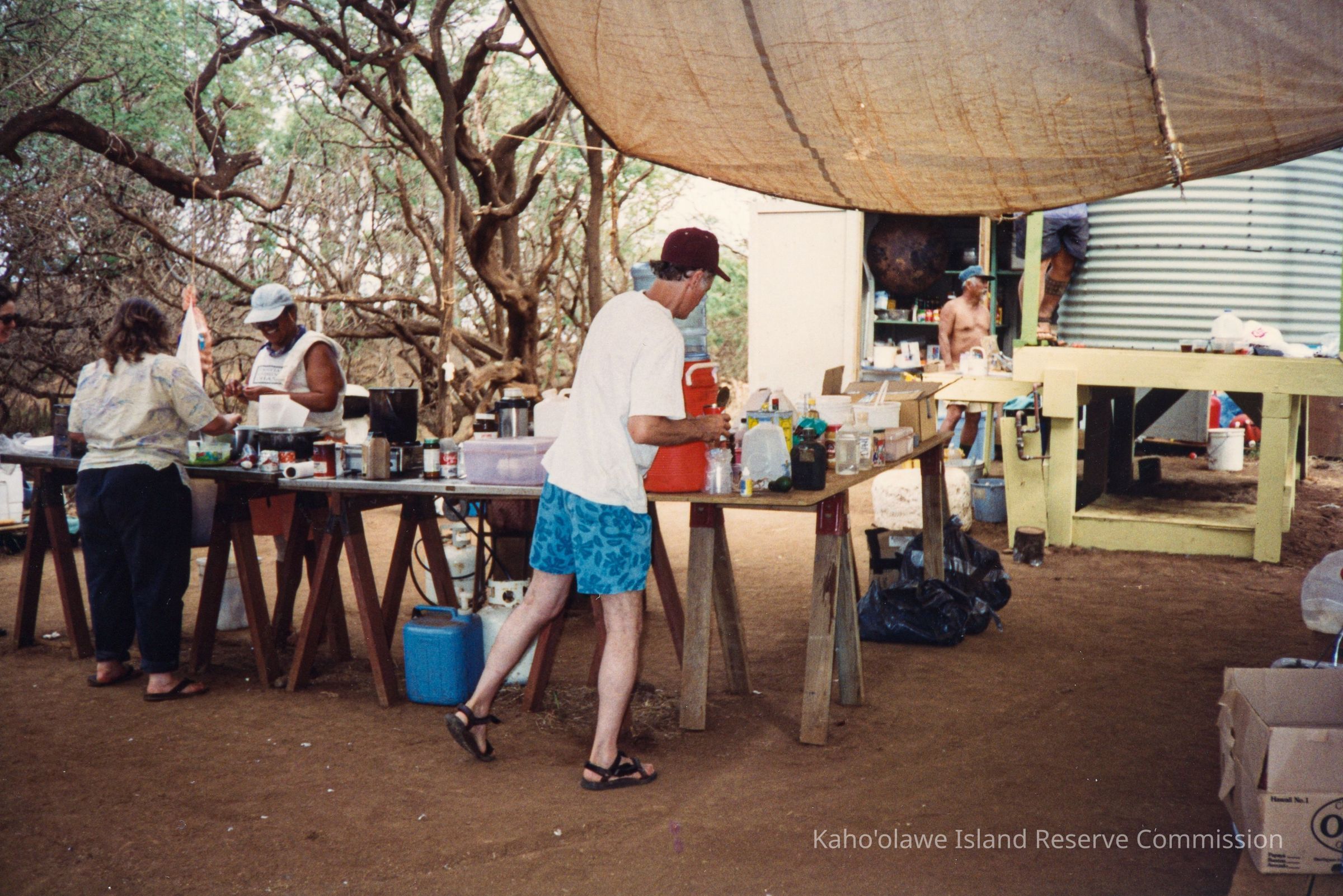 Several individuals are preparing food and drinks at an outdoor cooking area, with tables covered in various supplies and a tarp providing shade.