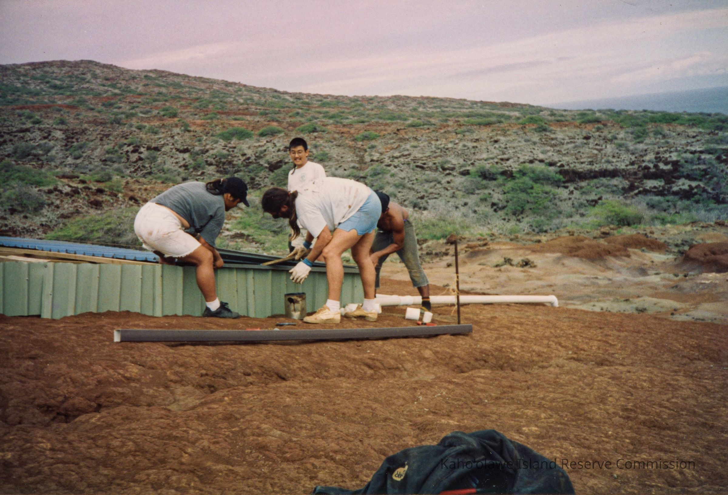 Color photograph of a four unidentified people working on attaching metal siding to a water catchment structure. The structure is on hardpan terrain.