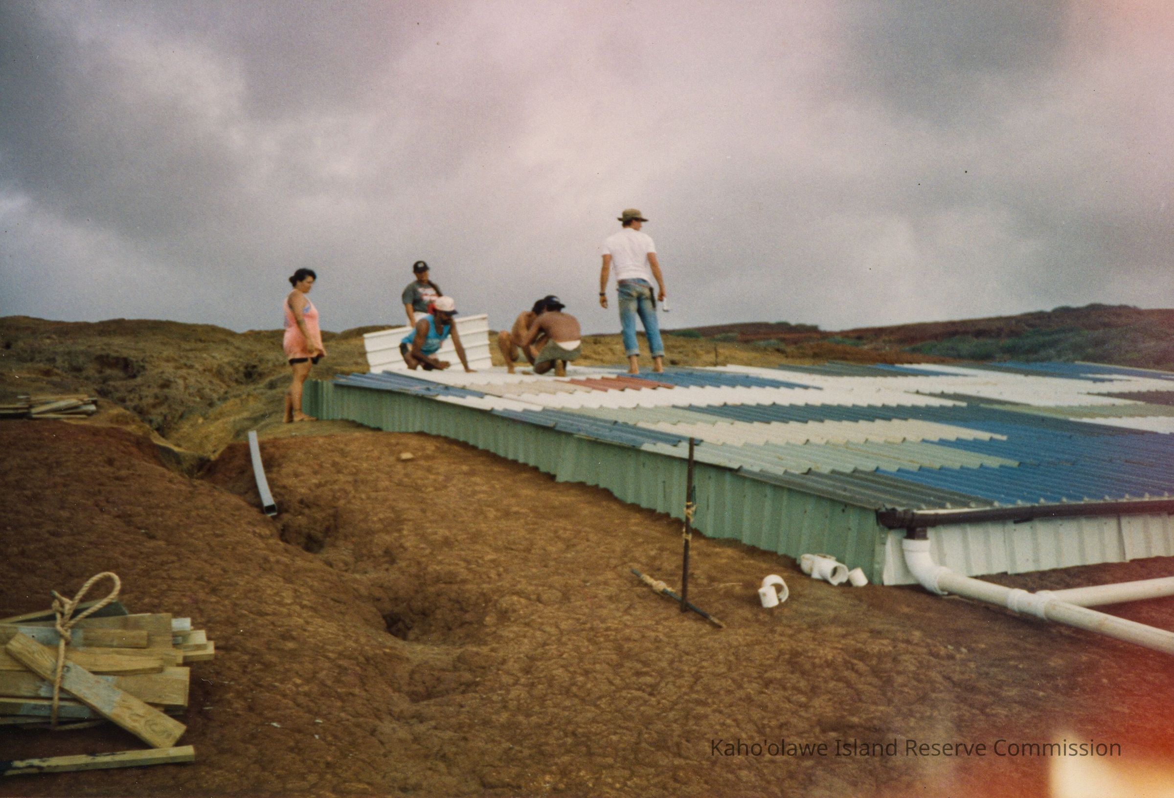 Color photograph of a group of unidentified people installing corrugated metal sheets on a water catchment structure. The structure sits on hardpan. The structure has PVC (polyvinyl chloride) piping attached to it. There is also construction material nearby.