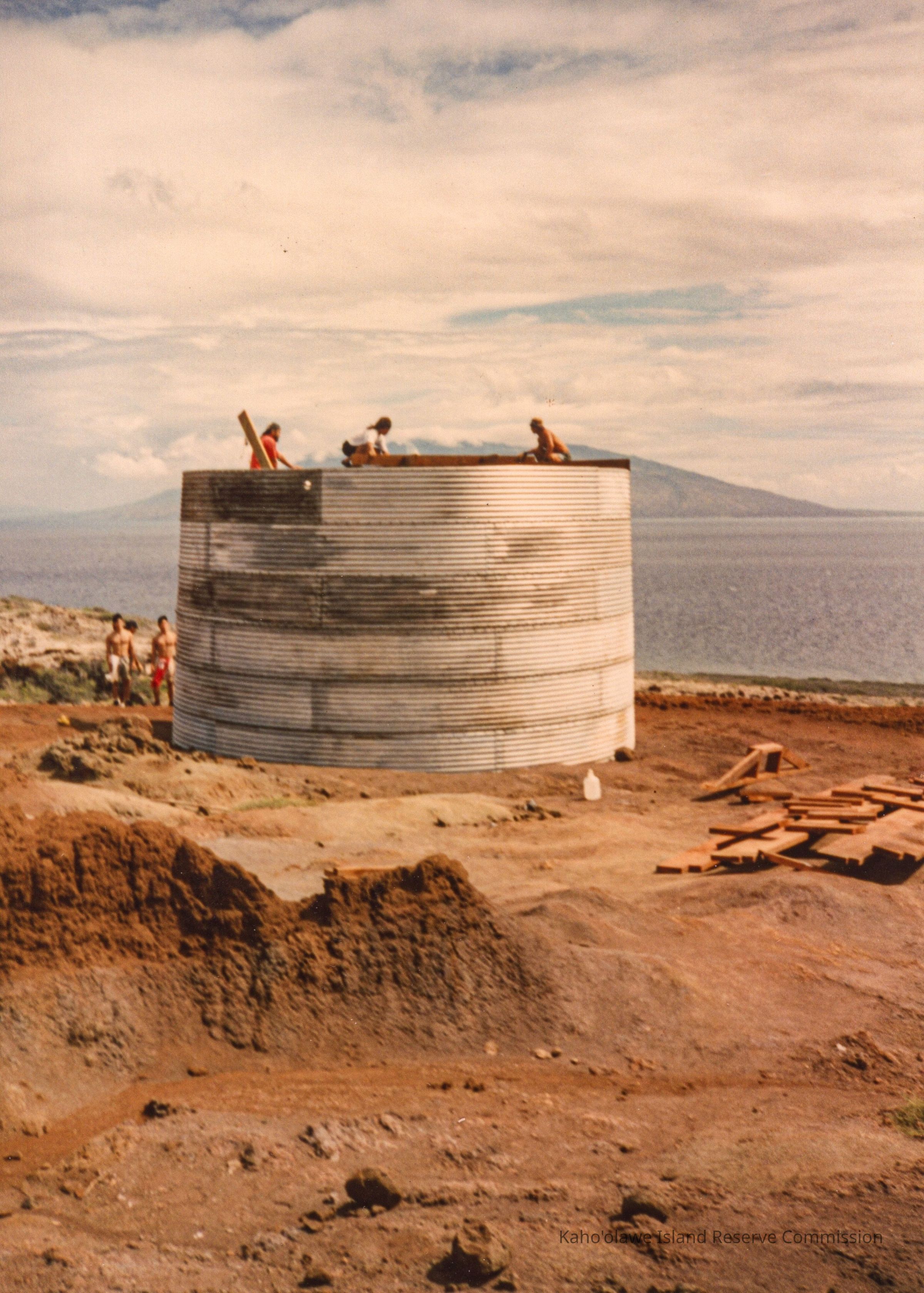 Distant view of a circular corrugated metal water catchment structure with three people working on top of it. There are several people standing to the side of it on hard pan. The ocean and part of Maui are in the background. This photo was probably taken during a Protect Kaho'olawe 'Ohana (PKO) access to build the water catchment in 1993.