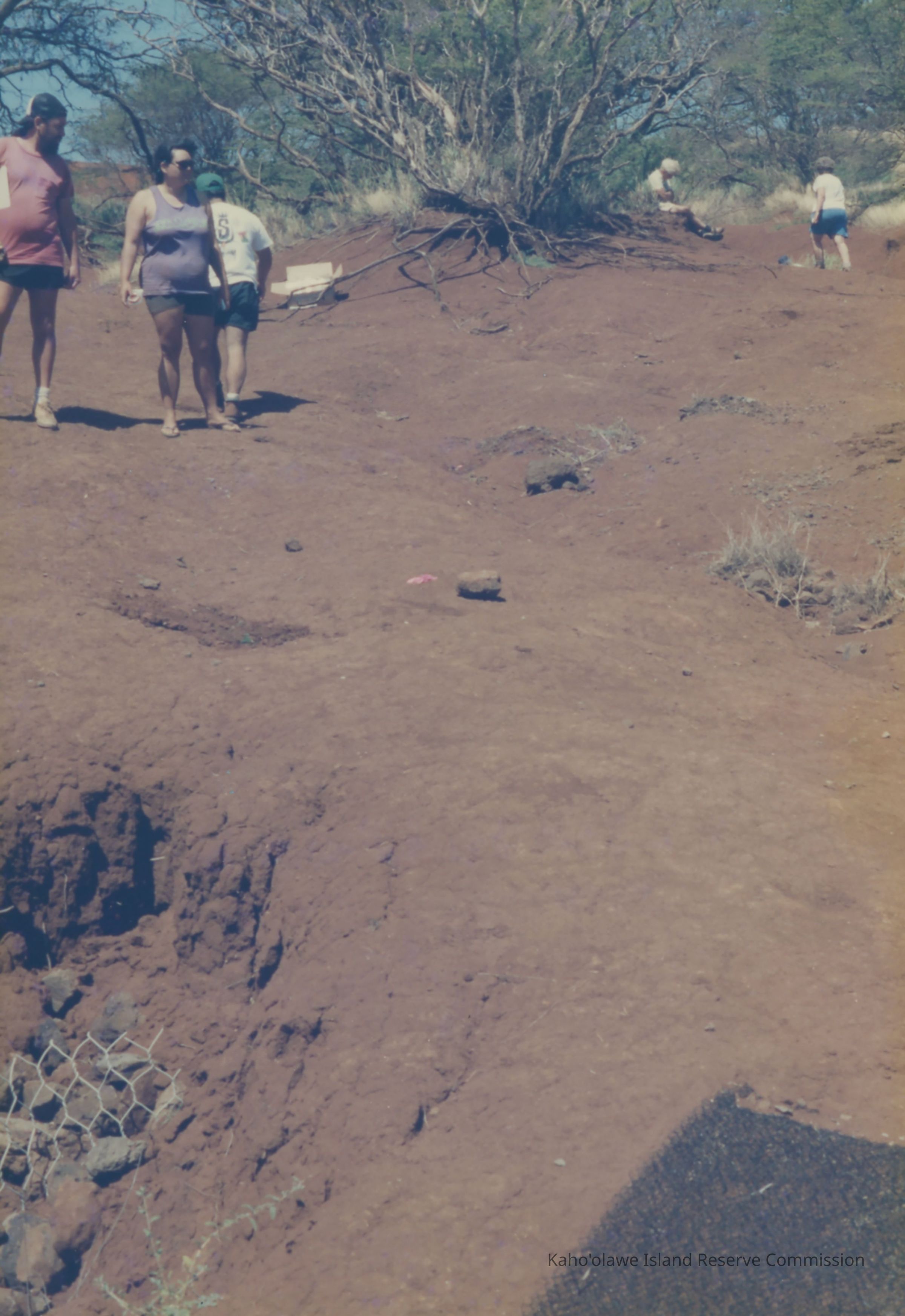 Color photo of several unidentified people working on hardpan. Part of a check dam in the lower left corner. A red-flagged item in the center of the photo.Photograph Details