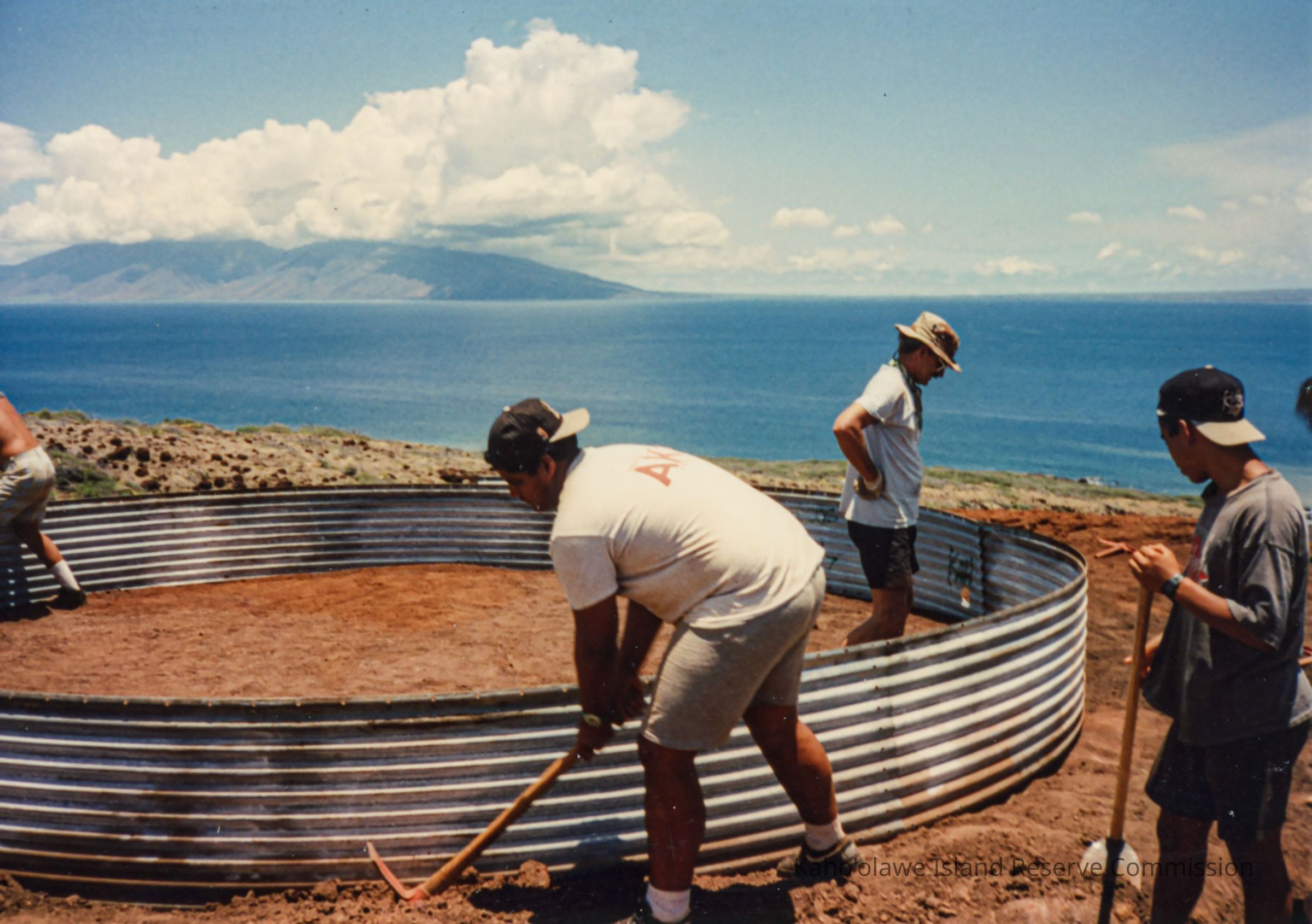 Color photo of people working on the base of the metal water catchment. This photo was probably taken at Wailuna in Hakioawa 'Ili.